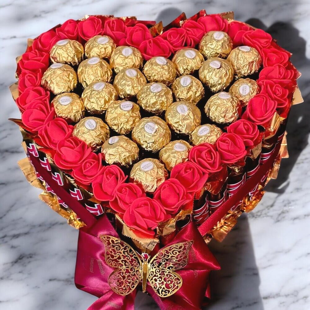 Ce magnifique cœur sucré est une véritable déclaration d’amour gourmande ! Composé de délicieux Ferrero Rocher soigneusement disposés au centre, entourés de roses rouges éclatantes, il crée une combinaison parfaite de raffinement et de douceur. L’élégant ruban bordeaux et le délicat motif de papillon en or ajoutent une touche de sophistication et d’élégance. Parfait pour toutes les occasions spéciales, ce cadeau saura enchanter vos proches avec sa beauté et son goût délicieux. Idéal pour la Saint-Valentin, un anniversaire ou tout simplement pour dire je t’aime. Offrez un moment sucré et inoubliable avec ce cœur gourmand qui ravira les papilles et le cœur !