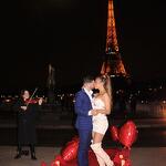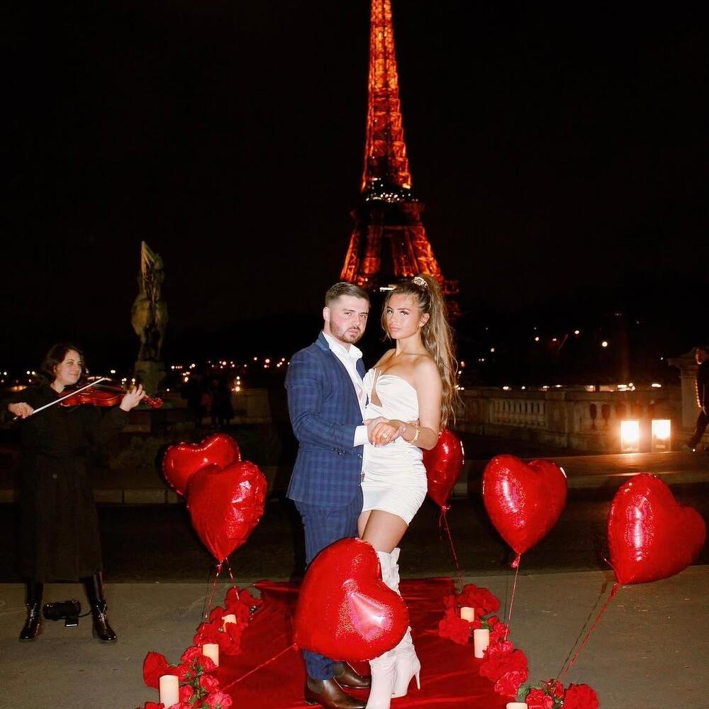 Proposal details: 1 red carpet, 8 heart balloons, decorative flowers and candles, and a violinist.