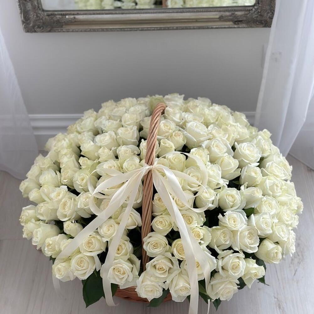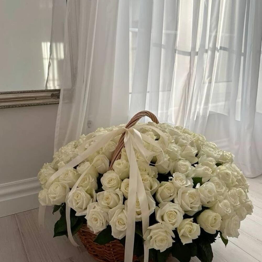 A luxurious basket of 101 pure white roses🤍