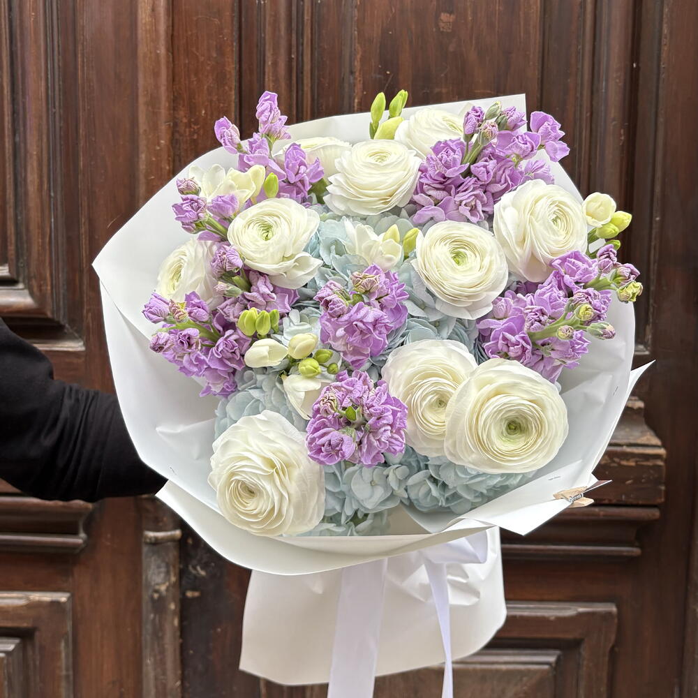 Hydrangea - 5 pcs Freesia - 5 pcs ranunculus - 10 pcs matthiola - 10 pcs