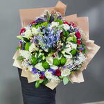 eucalyptus leaves - 6 pcs rose rouge red - 10 pcs gypsophile saumon - 5 pcs rose blanche avalanche - 10 pcs exemple - 1 pcs liste orientale - 5 pcs estatis violet - 5 pcs anastasia vert - 10 pcs
