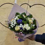 Alstroemeria - 3 pcs Salal - 5 pcs santini - 2 pcs freesias - 4 pcs lisianthus violet - 1 pcs chamomile - 2 pcs aspidistras - 3 pcs jacinthes - 1 pcs différentes roses - 7 pcs