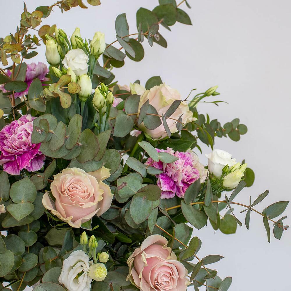 Lisianthus - 3 pcs rose - 5 pcs œillet - 7 pcs divers verts - 5 pcs