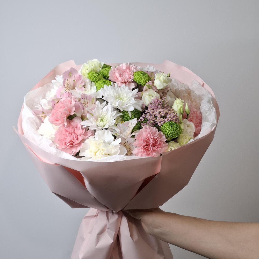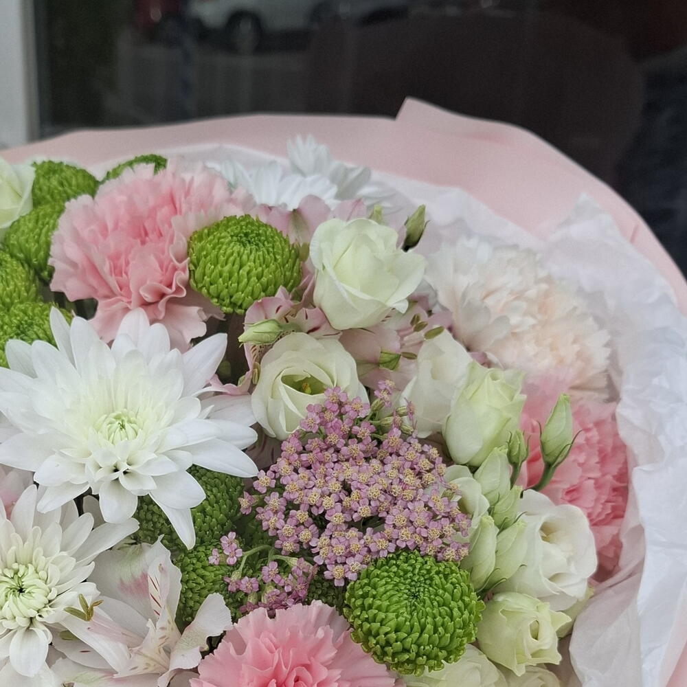 Un bouquet délicat et généreux, composé dun charmant mélange de chrysanthèmes, dœillets, de lisianthus et de marguerites. Cette magnifique composition, aux couleurs douces et aux fleurs qui durent longtemps, est le cadeau idéal pour égayer la journée de quelquun et créer une ambiance chaleureuse et joyeuse.