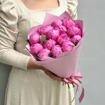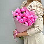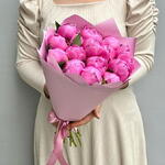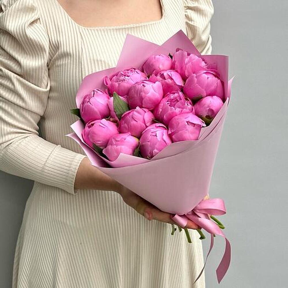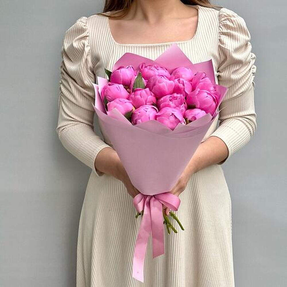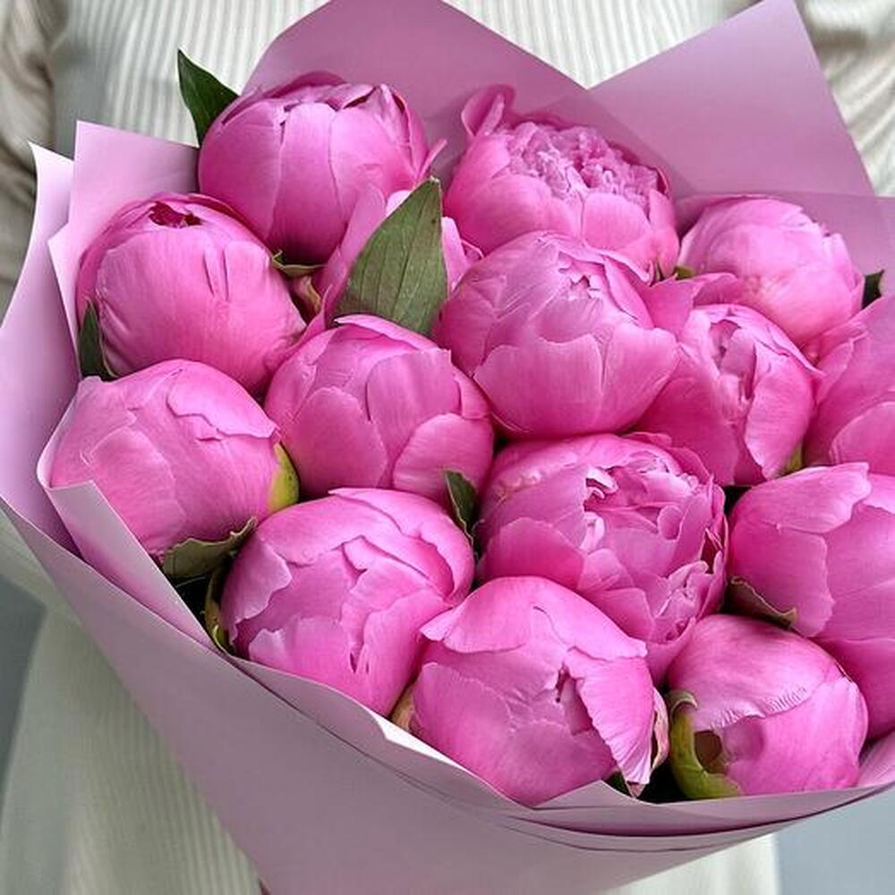 In front of us is a luxurious, lush bouquet of bright pink peonies. Each flower is a huge, lush bud surrounded by dense, velvety petals. They bloom like fragile roses, but much larger and with a richer, juicier shade of pink. The stems of the bouquet are long and straight, the green leaves give a beautiful contrast to the bright colour of the flowers. The sunlight softly illuminates each peony, creating a play of shadows and highlights on the petals, making them seem even more lively and juicy. The whole bouquet exudes a sweet, intoxicating fragrance that fills the air around it. It is a true embodiment of femininity, beauty and elegance.