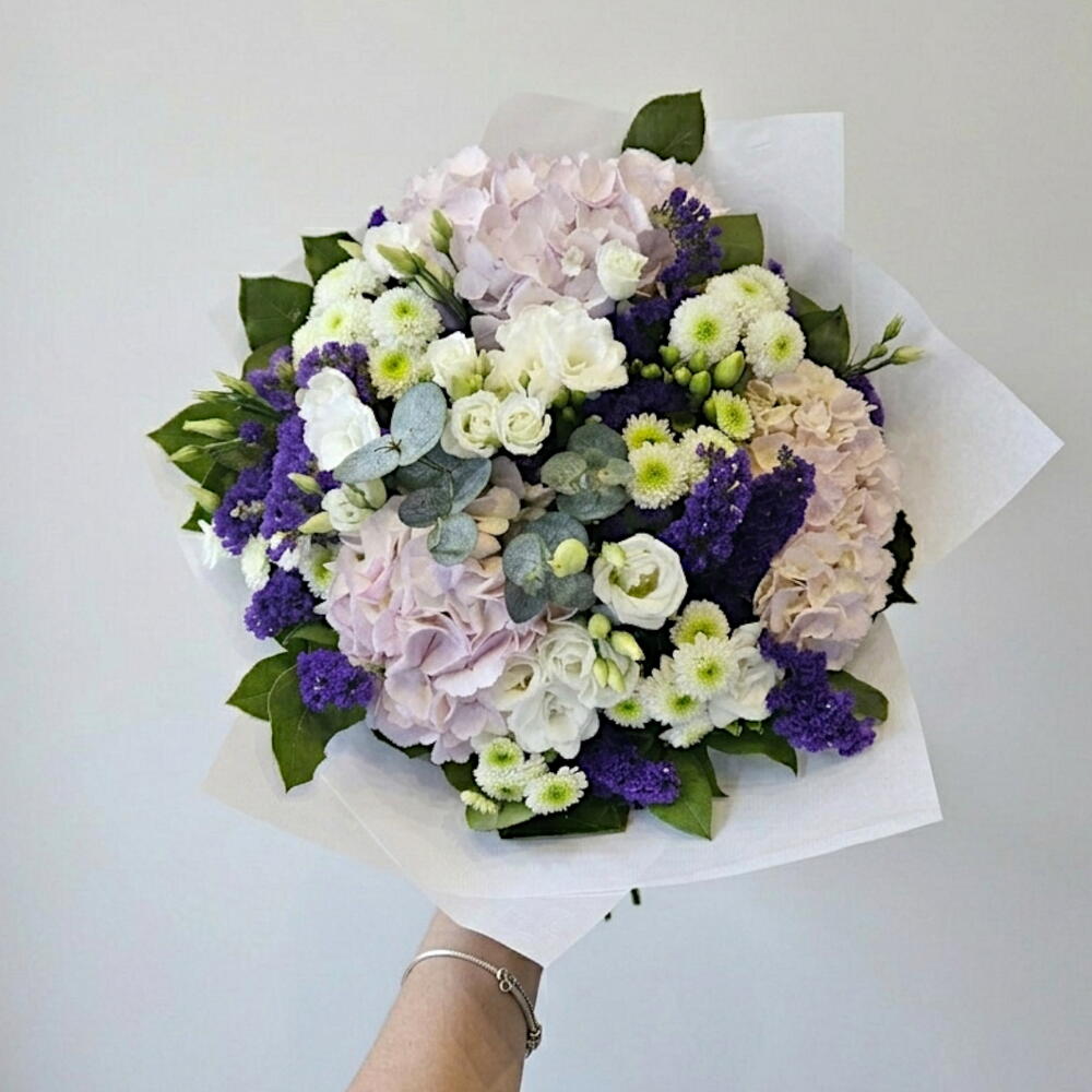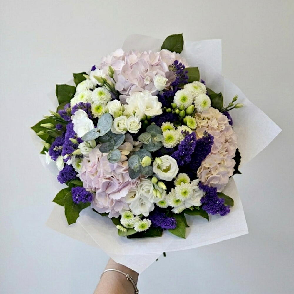 Statice - 4 pcs Eucalyptus - 3 pcs hydrangea - 3 pcs Lisianthus - 4 pcs chrysanthème - 5 pcs