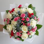 Un bouquet raffiné et plein de caractère, mêlant la douceur des roses blanches et roses à l’originalité des touches bleutées d’eryngium. Élégant et moderne, il est parfait pour surprendre et exprimer des sentiments sincères avec une touche unique.