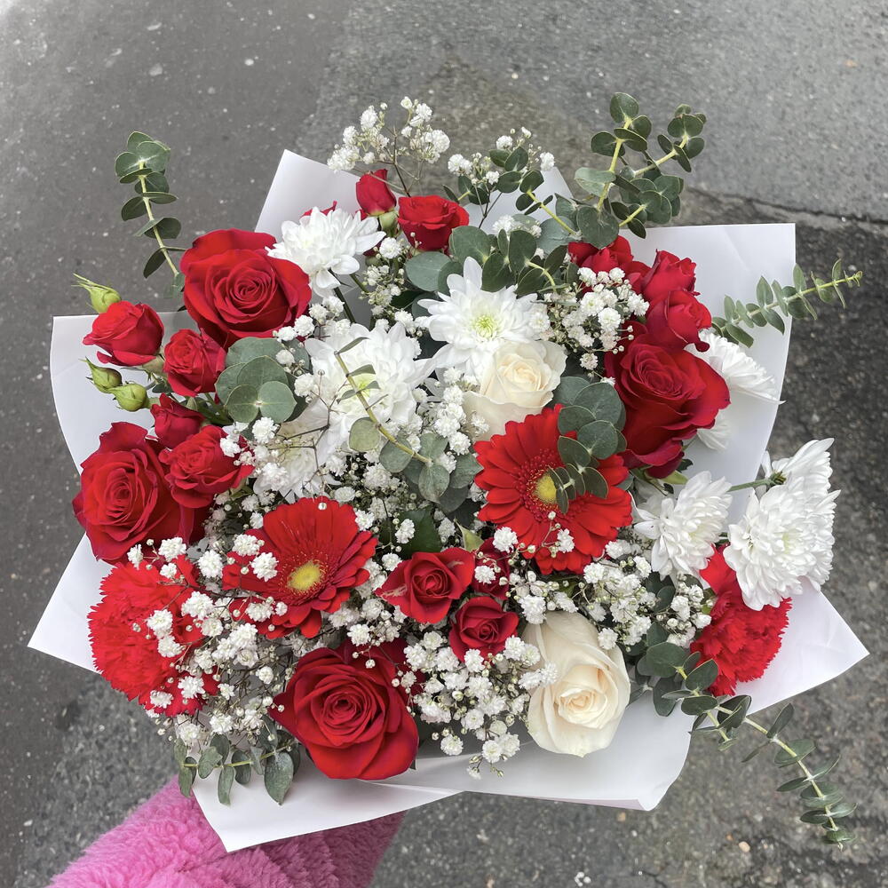 Ruscus - 4 pcs baby breath - 2 pcs chrisantemum - 2 pcs red roses - 4 pcs white roses - 2 pcs spray red roses - 3 pcs