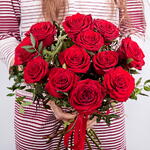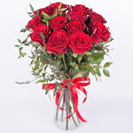 Un encantador ramo compuesto por 12 exquisitas rosas de un tono intenso, complementado con ramitas frescas de follaje. Este ramo será una sincera muestra de cariño y realzará cualquier ocasión. Transmite la calidez de tus sentimientos con este hermoso ramo.