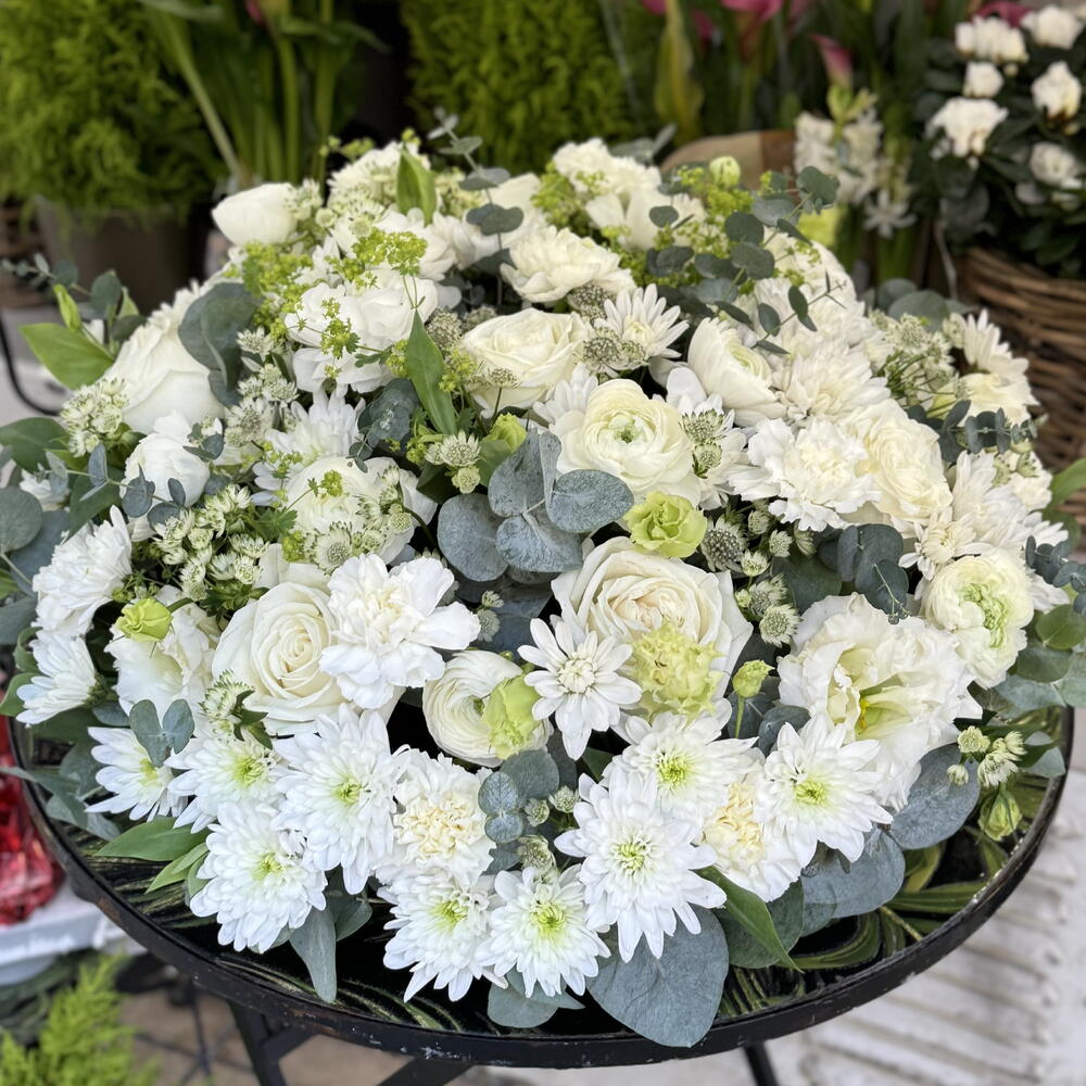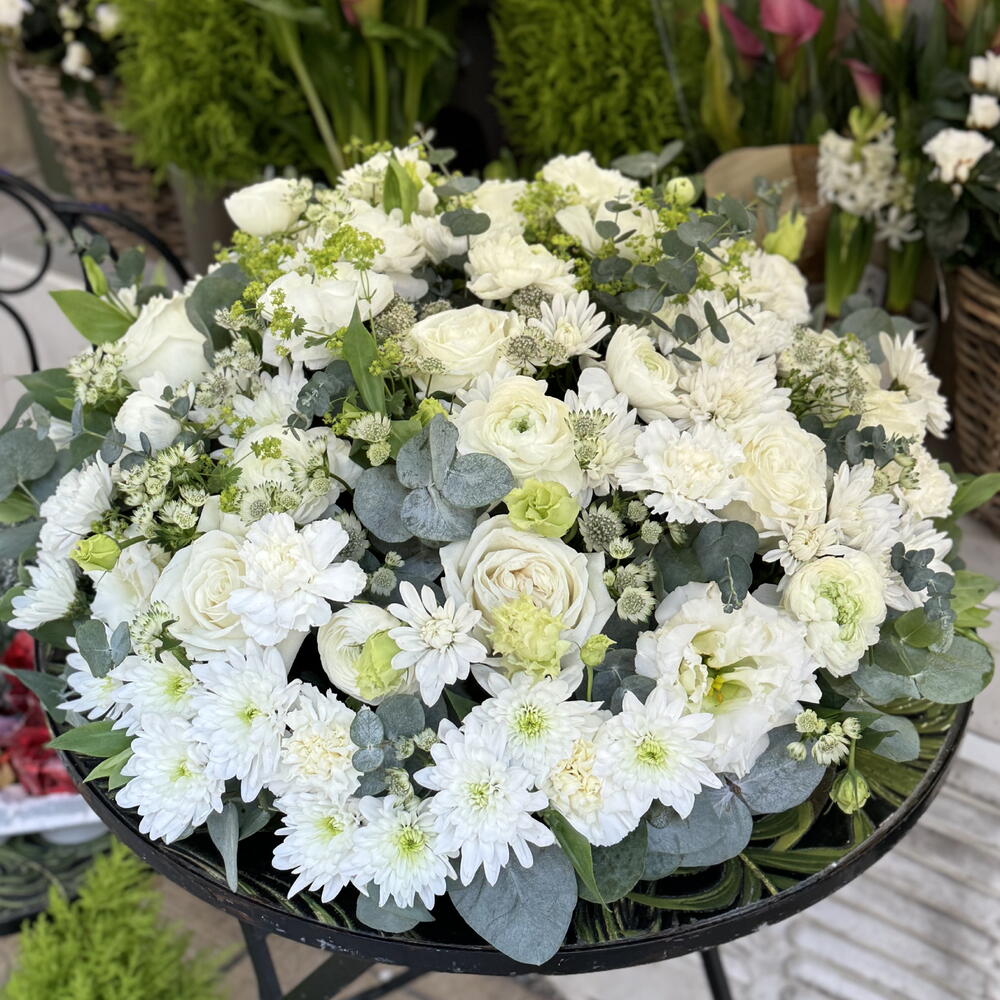 Astrantia - 1 pcs Eucalyptus - 1 pcs Alstroemeria - 1 pcs œillet - 1 pcs chrysanthèmes - 1 pcs rose blanche - 1 pcs