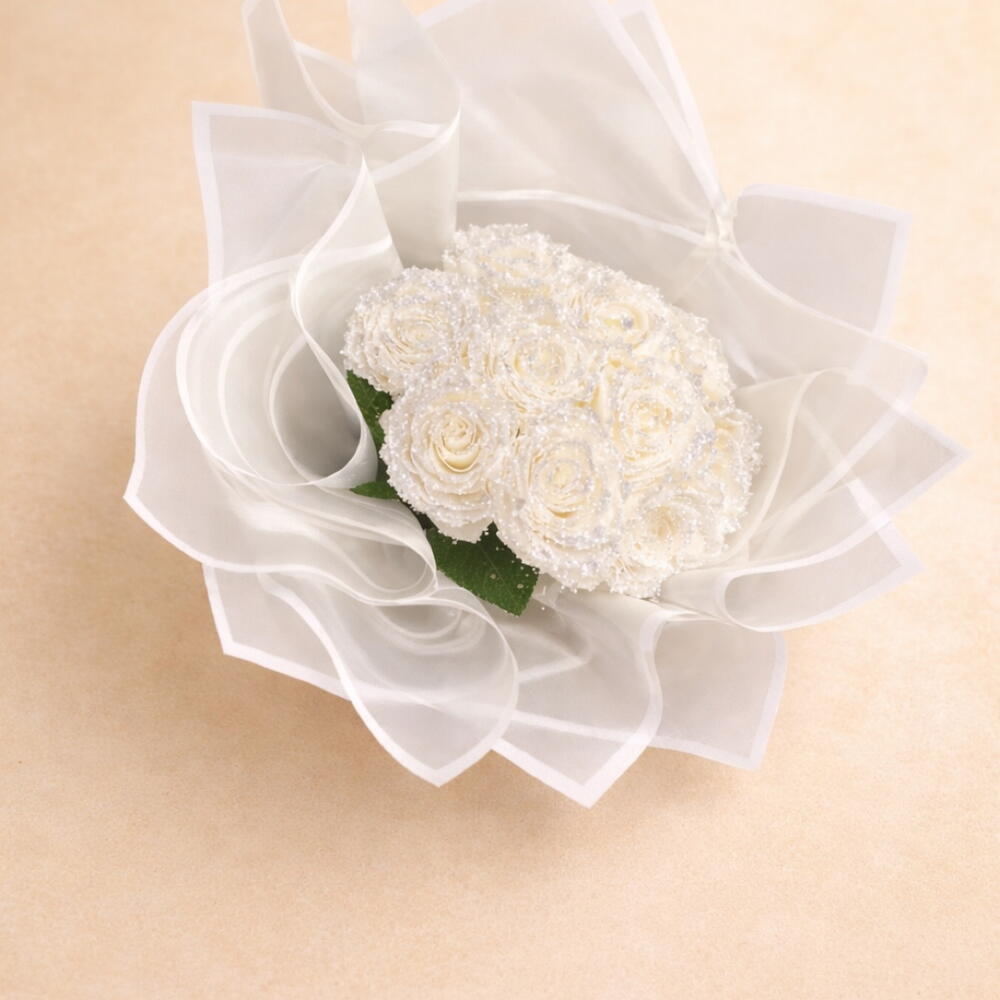 Un bouquet dexception composé de roses éternelles blanches délicatement pailletées, symbole de pureté, délégance et damour intemporel. Chaque rose est soigneusement sélectionnée et sublimée pour offrir un éclat raffiné qui traverse le temps. Durée de vie Les roses éternelles conservent leur beauté pendant 3 à 5 ans, sans aucun entretien, tout en gardant leur forme et leur éclat dorigine. +* Conseils de conservation Pour préserver toute leur splendeur : • À conserver à labri de lhumidité • Eviter lexposition directe à la lumière et au soleil • Ne pas arroser