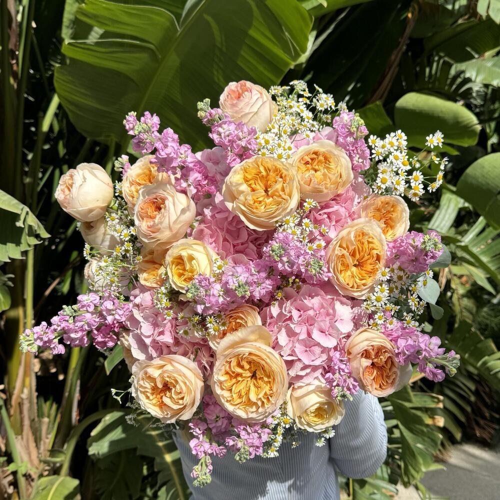 The gorgeous and bright flower bouquet that brings a burst of sunshine. Featuring Pink Hydrangea, Yellow Roses Cream Expression, Pink Matthiola and delicate White Chamomile this flower arrangement exudes summer fragrances. A true symbol of light and sun, created to brighten your beloved one’s day!