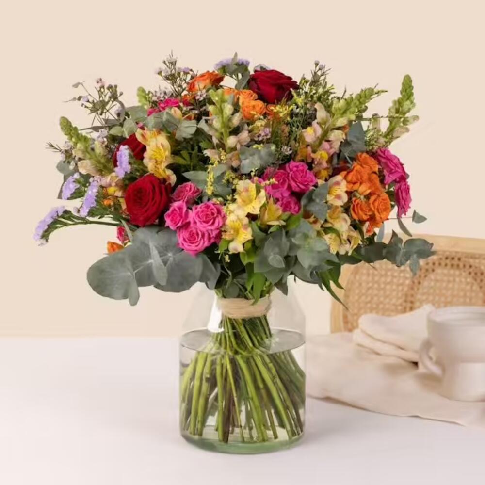 Alstroemeria - 7 pcs aucaliptus - 7 pcs rose rouge - 9 pcs luntisque - 5 pcs gipsophil - 5 pcs oillet brancheau - 5 pcs rose brancheau - 5 pcs