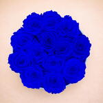 Elegant white box adorned with a blue ribbon, containing 14 royal blue preserved roses. A modern and luxurious presentation, perfect for gifting. The roses, preserved to retain their beauty for 2 to 5 years, require no maintenance: simply avoid humidity and direct sunlight. A chic, long-lasting gift ideal for all occasions.