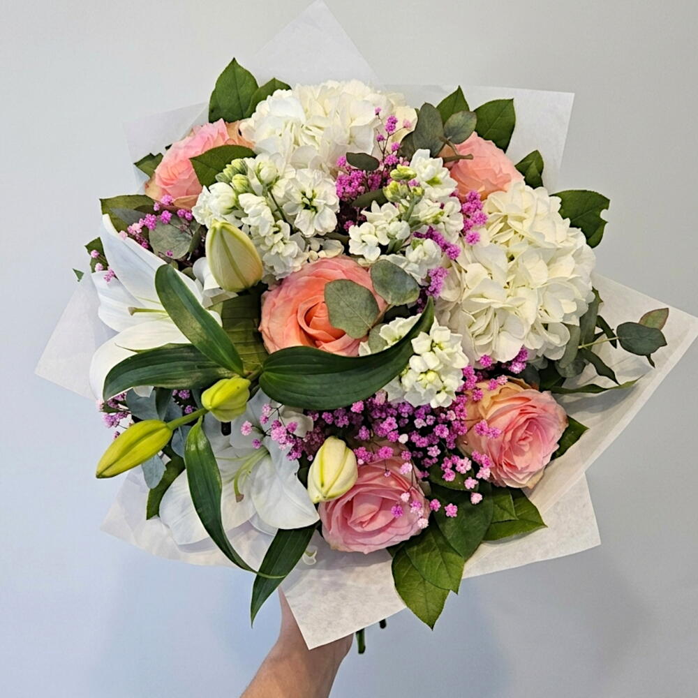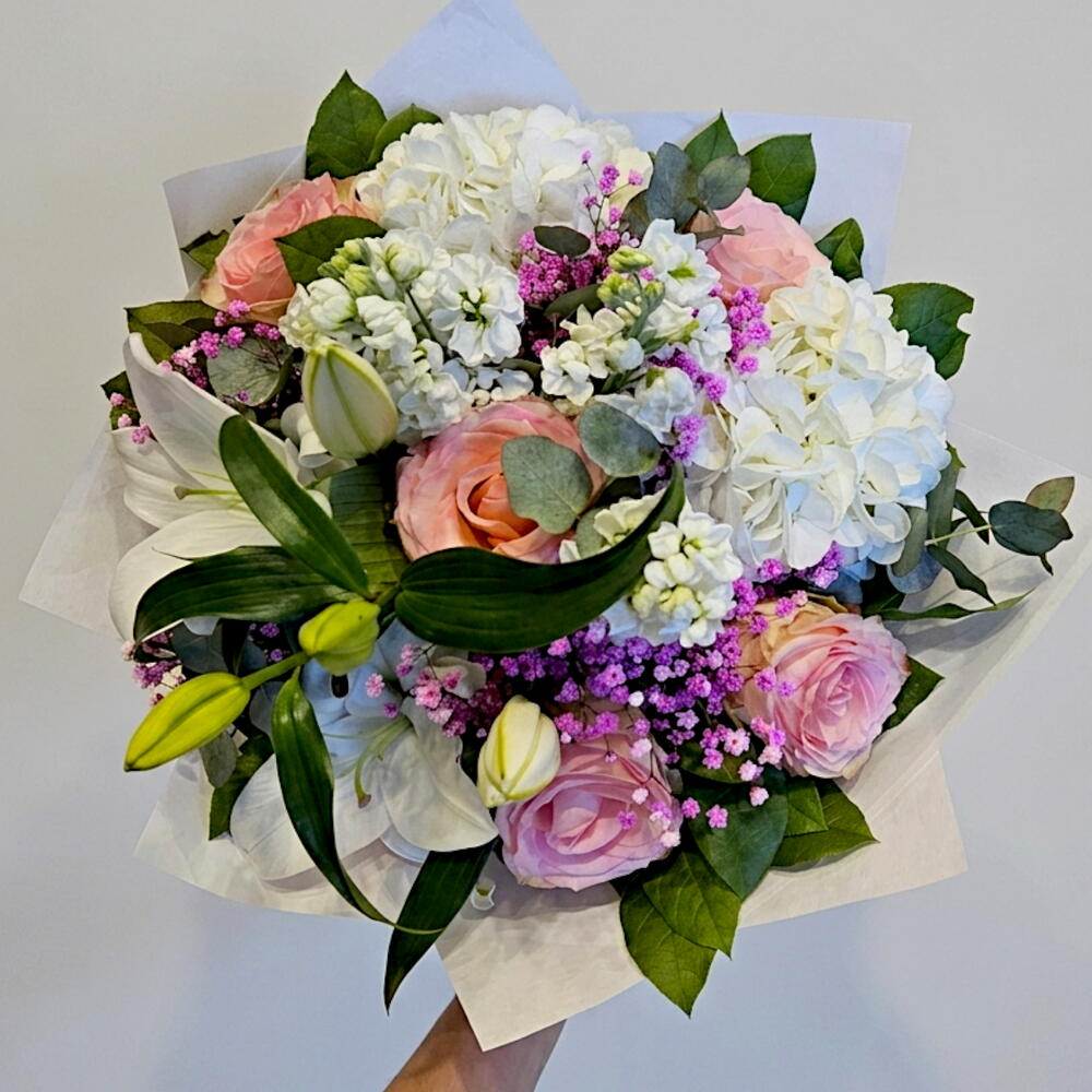 Un bouquet élégant et aérien aux tons pastel, mêlant la douceur des roses, la générosité de l’hortensia et la délicatesse des petites fleurs. Sa palette tendre et raffinée en fait un choix parfait pour exprimer des émotions sincères, apporter de la douceur et sublimer chaque instant.