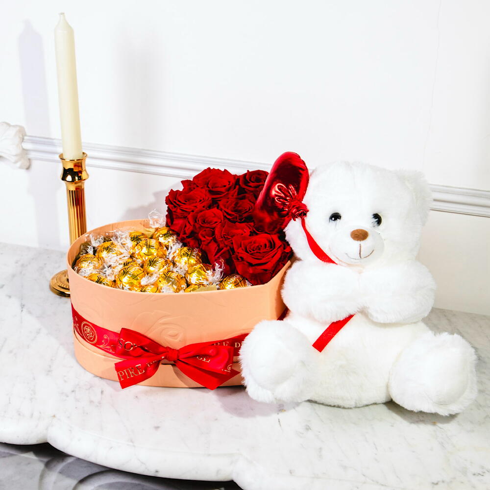 Create a truly unforgettable moment with this elegant and romantic gift set, designed to combine beauty, indulgence, and tenderness. This refined box features éternel red roses, carefully arranged to showcase their natural beauty and deep, passionate color. They are paired with a selection of premium chocolates, adding a delicious and indulgent touch to the gift. To complete this charming set, a soft teddy bear holding a heart brings warmth and emotion, making it the perfect surprise for someone special. Presented in a stylish box with a decorative ribbon, this gift is ideal for romantic occasions, birthdays, anniversaries, or simply to express your love.