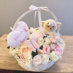 Ce panier délicat et plein de douceur est une véritable déclaration de tendresse, idéal pour célébrer une naissance ou une baby shower. Les fleurs artificielles aux tons pastel créent une harmonie élégante et durable, sans entretien contraignant. L’ensemble est complété par un adorable nounours, un coussin décoratif «Hello Baby», de jolies chaussettes pour bébé et une rose sous cloche qui apporte une touche de poésie. Ce cadeau tout-en-un évoque la chaleur, la protection et l’amour dès le premier regard. Grâce à ses éléments artificiels, il conserve sa beauté au fil du temps. Pour l’entretien, il suffit de dépoussiérer délicatement les fleurs et accessoires avec un chiffon sec ou légèrement humide. À conserver à l’abri de l’humidité et du soleil direct pour préserver les couleurs. Un panier avec fleurs artificielles, un nounours, coussin, chaussettes et rose cloche.