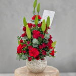 Une composition spectaculaire et élégante en forme pyramidale, dominée par des roses rouges intenses symbolisant la passion. Les boutons de lys apportent de la hauteur et du raffinement, créant un bouquet majestueux idéal pour impressionner et célébrer les moments les plus importants.