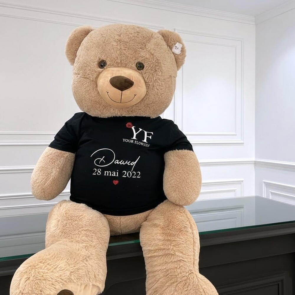 This large personalized teddy bear is a gift full of tenderness, perfect for marking an important moment in life. Soft and comforting, it charms with its generous size and endearing smile. Its personalized black T-shirt with a name and a date makes it a unique keepsake charged with emotion. This teddy bear is ideal for a birth, a birthday, a baptism, a declaration of love, or any special occasion to commemorate. It will easily find its place in a bedroom, a living room, or as a symbolic decorative element. To preserve its softness, it is recommended to clean it gently by hand or by surface cleaning, and to avoid prolonged exposure to sunlight or humidity.