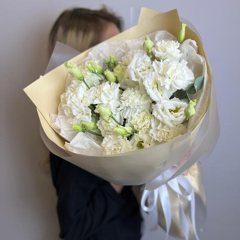 Eucalyptus - 2 pcs dianthus white - 15 pcs feuillage - 10 pcs lisanthus white - 3 pcs