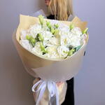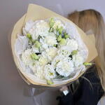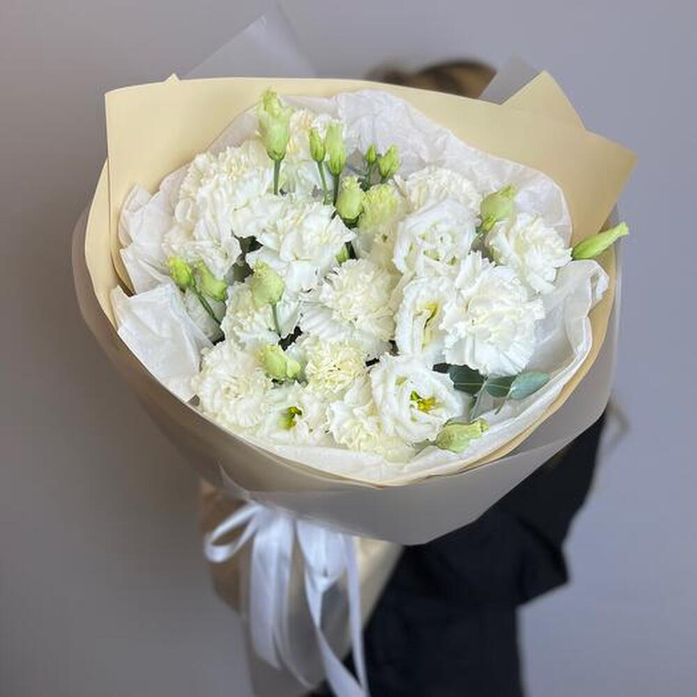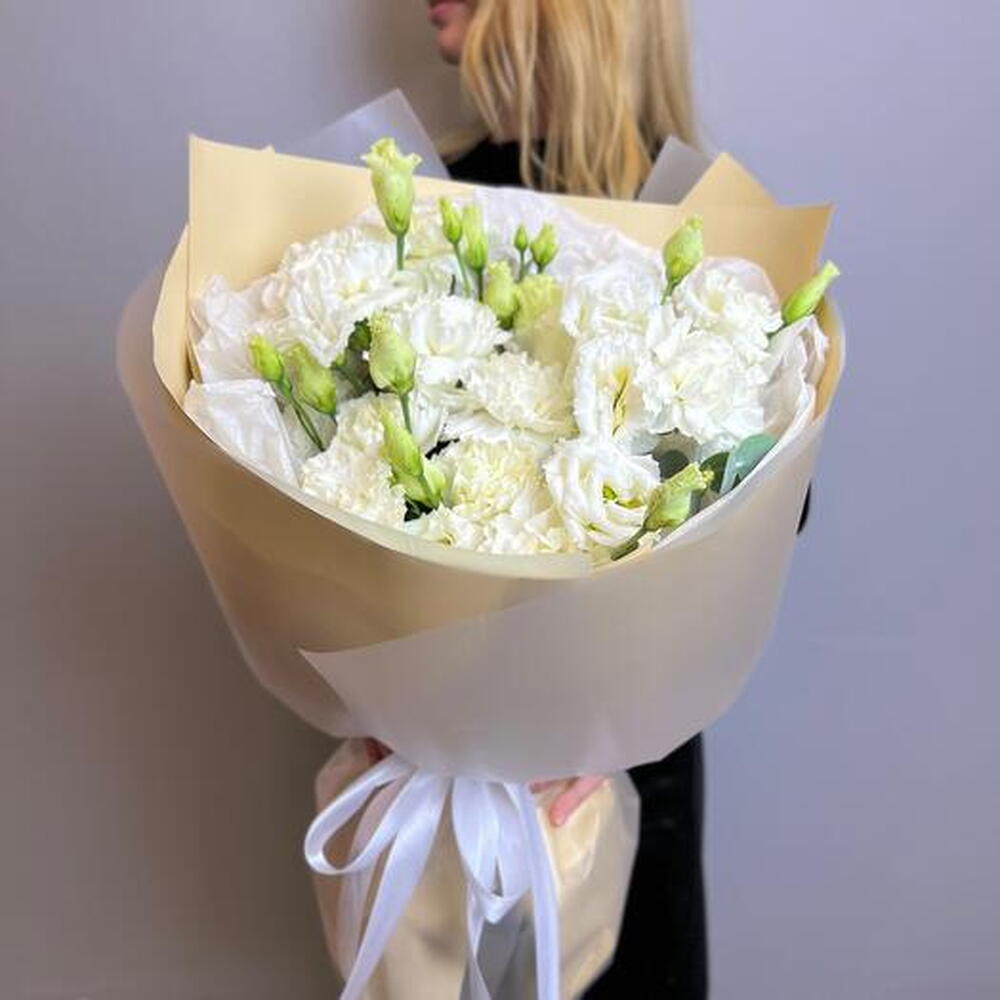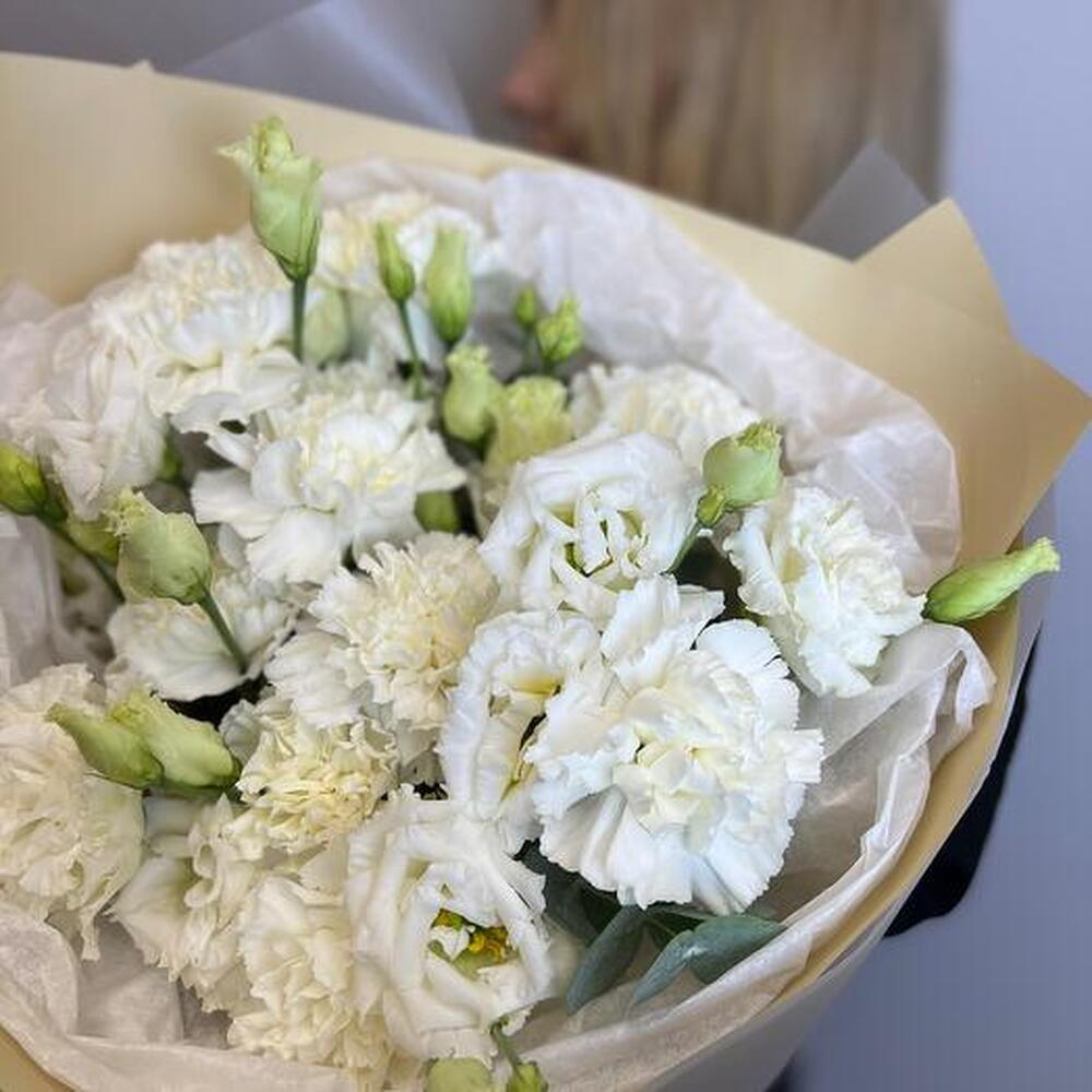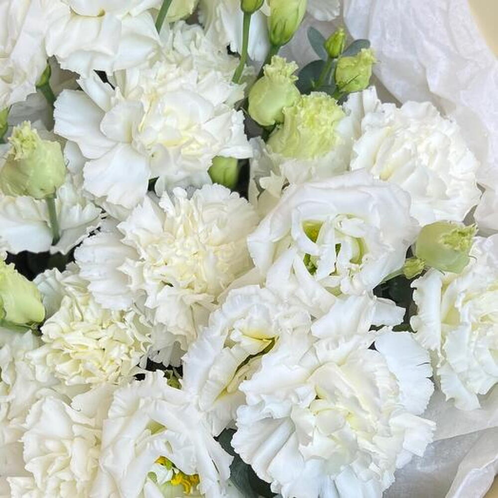 Discover the serene beauty of our bouquet, featuring a pristine combination of white dianthus and lisianthus (eustoma). The delicate, ruffled petals of the dianthus blend seamlessly with the graceful blooms of the lisianthus, creating a harmonious and sophisticated arrangement. Perfect for weddings, anniversaries, or any special occasion, this bouquet embodies purity and elegance. Its timeless charm and serene color palette make it an exquisite gift for expressing heartfelt sentiments.