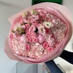 Spray rose - 7 pcs hydrangea - 5 pcs Lisianthus - 5 pcs wrapping paper - 6 pcs roses - 7 pcs