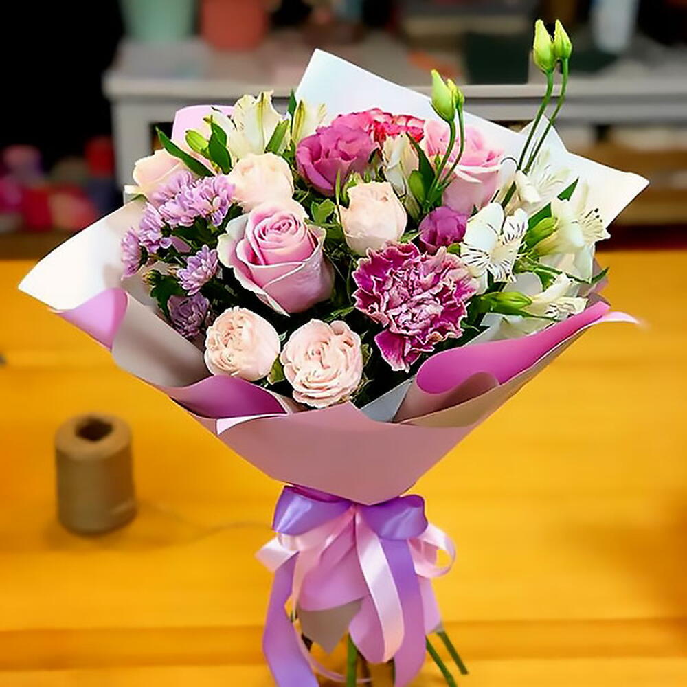 Alstroemeria - 3 pcs rose pink - 7 pcs lysianthus - 3 pcs feuillage - 5 pcs oeuillets - 3 pcs