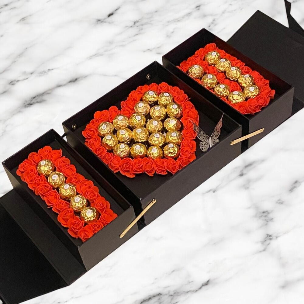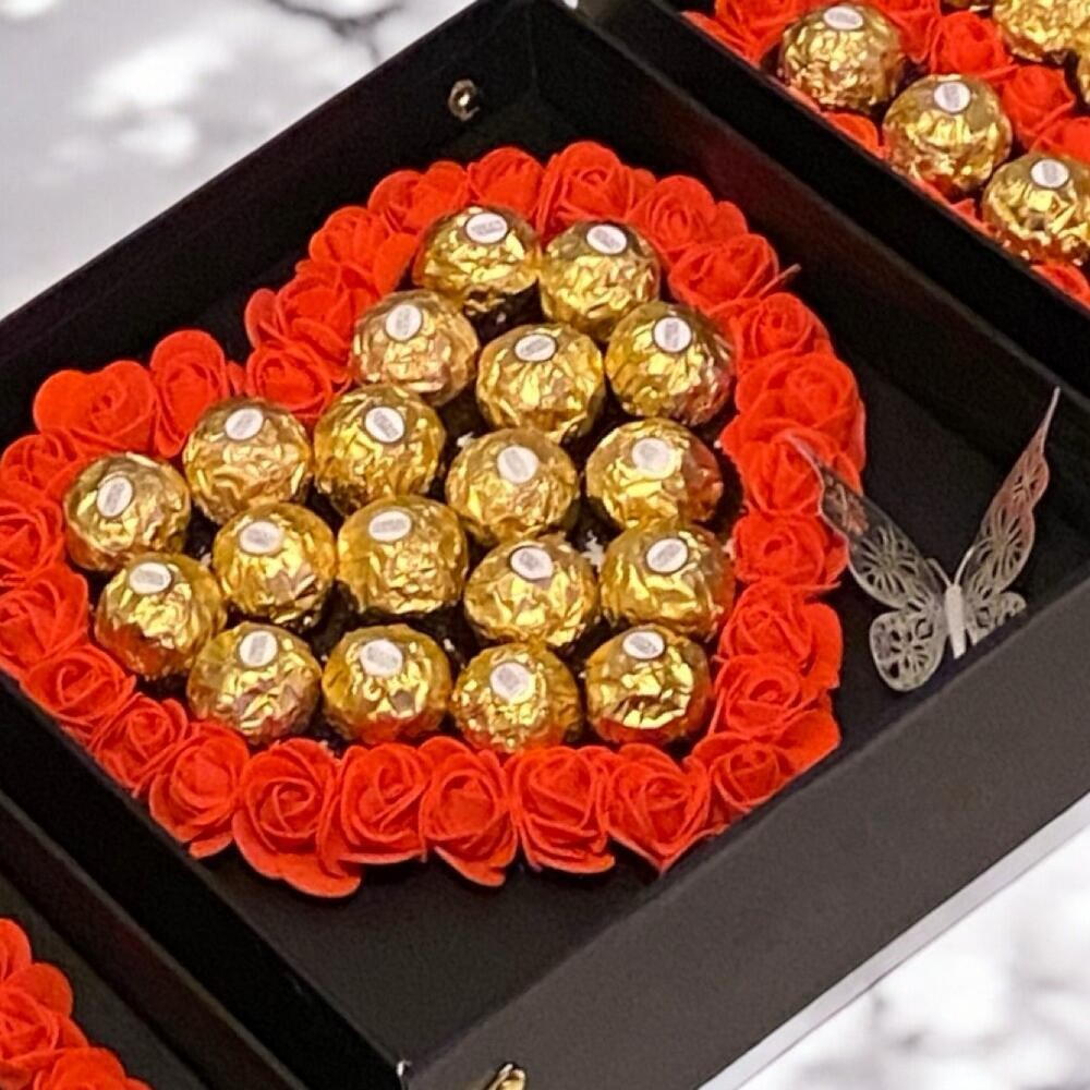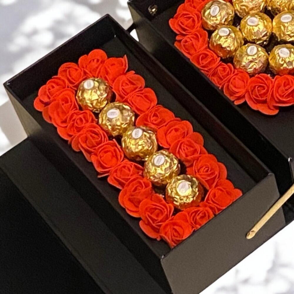 Cette composition élégante en forme de I ❤️ U est une véritable déclaration damour. Chaque boîte est remplie de roses rouges fraîches et de délicieux Ferrero Rocher, disposés avec soin pour créer un effet visuel époustouflant. Le cœur central est délicatement orné de chocolat, tandis que les lettres I et U complètent ce message sucré et romantique. Le design raffiné, avec une touche de papillon en métal doré, ajoute un côté chic et élégant. Parfait pour la Saint-Valentin, un anniversaire ou toute autre occasion spéciale, ce cadeau saura ravir et toucher les cœurs. Offrez ce symbole damour unique et laissez chaque chocolat fondre dans un doux moment de bonheur ! Bouquet de chocolat I❤️U