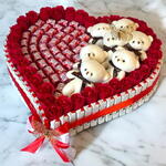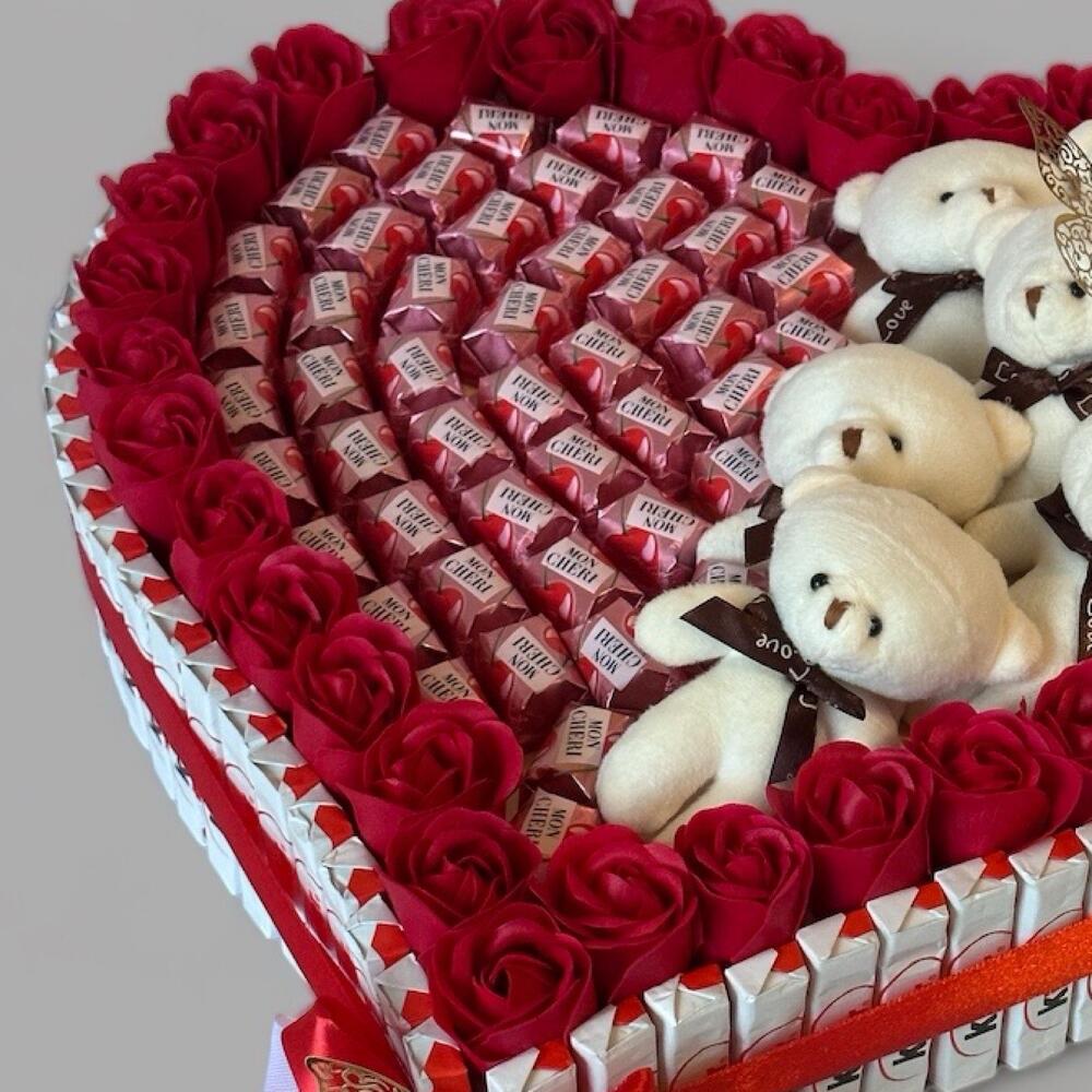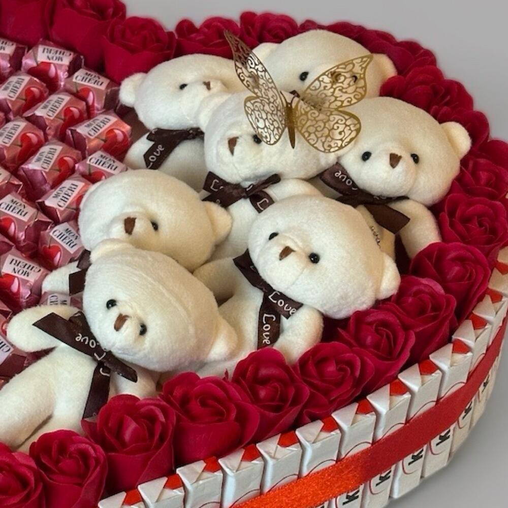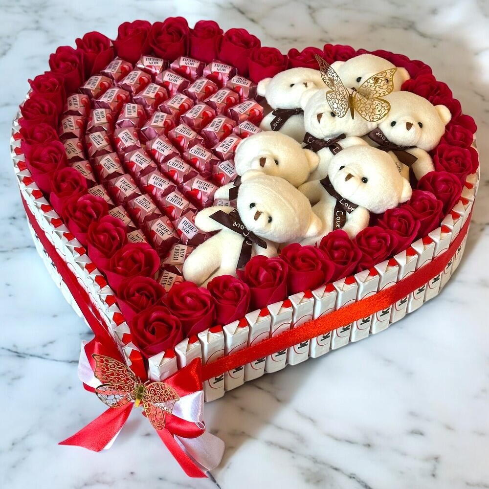 Ce magnifique cœur gourmand est un cadeau parfait pour exprimer tout votre amour. Enveloppé de roses rouges éclatantes et décoré de petits ours en peluche adorables, il ravira les yeux et les papilles. À lintérieur, des chocolats délicats viennent compléter cette œuvre sucrée, créant une harmonie parfaite entre douceur et tendresse. Le ruban rouge et le papillon en or ajoutent une touche délégance et de raffinement à cette création unique. Idéal pour la Saint-Valentin, un anniversaire ou toute autre occasion spéciale, ce cadeau fera fondre le cœur de celui ou celle qui le recevra. Offrez ce symbole d’amour et de gourmandise pour un moment inoubliable ! Cœur de chocolat avec nounours 🧸