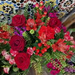 Eucalyptus - 5 pce hypericum - 3 pce rose rouge - 10 pce astro - 3 pce taspli - 3 pce rose branchue - 5 pce