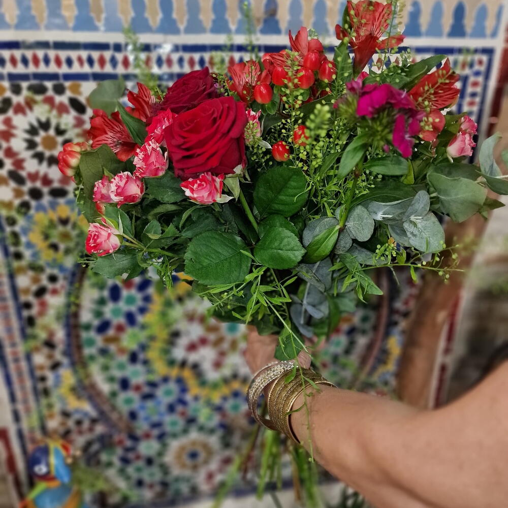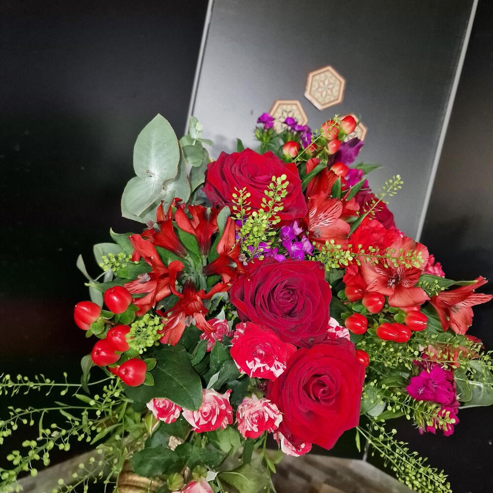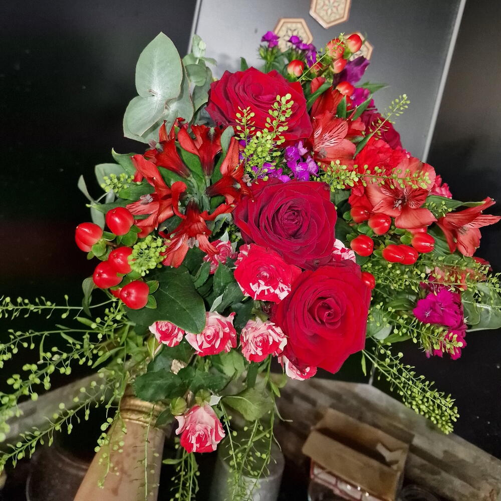 Eucalyptus - 5 pce hypericum - 3 pce rose rouge - 10 pce astro - 3 pce taspli - 3 pce rose branchue - 5 pce