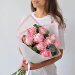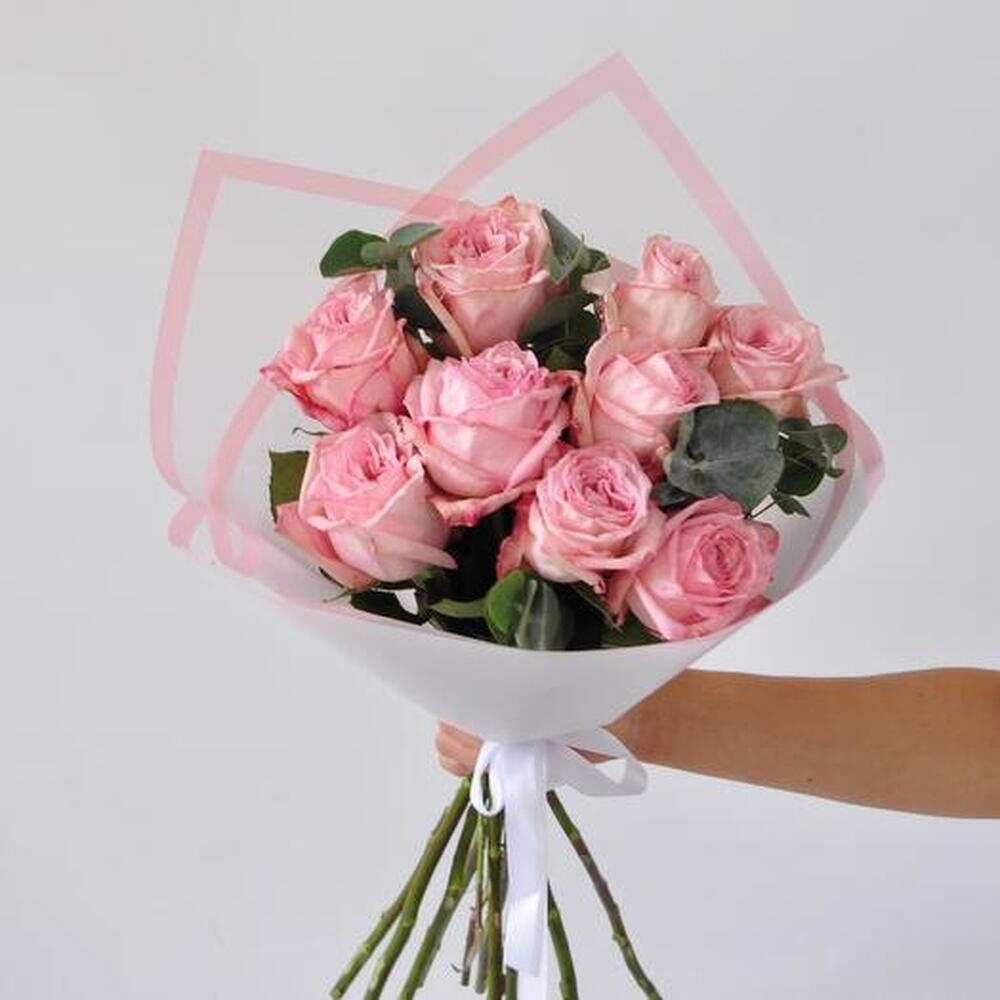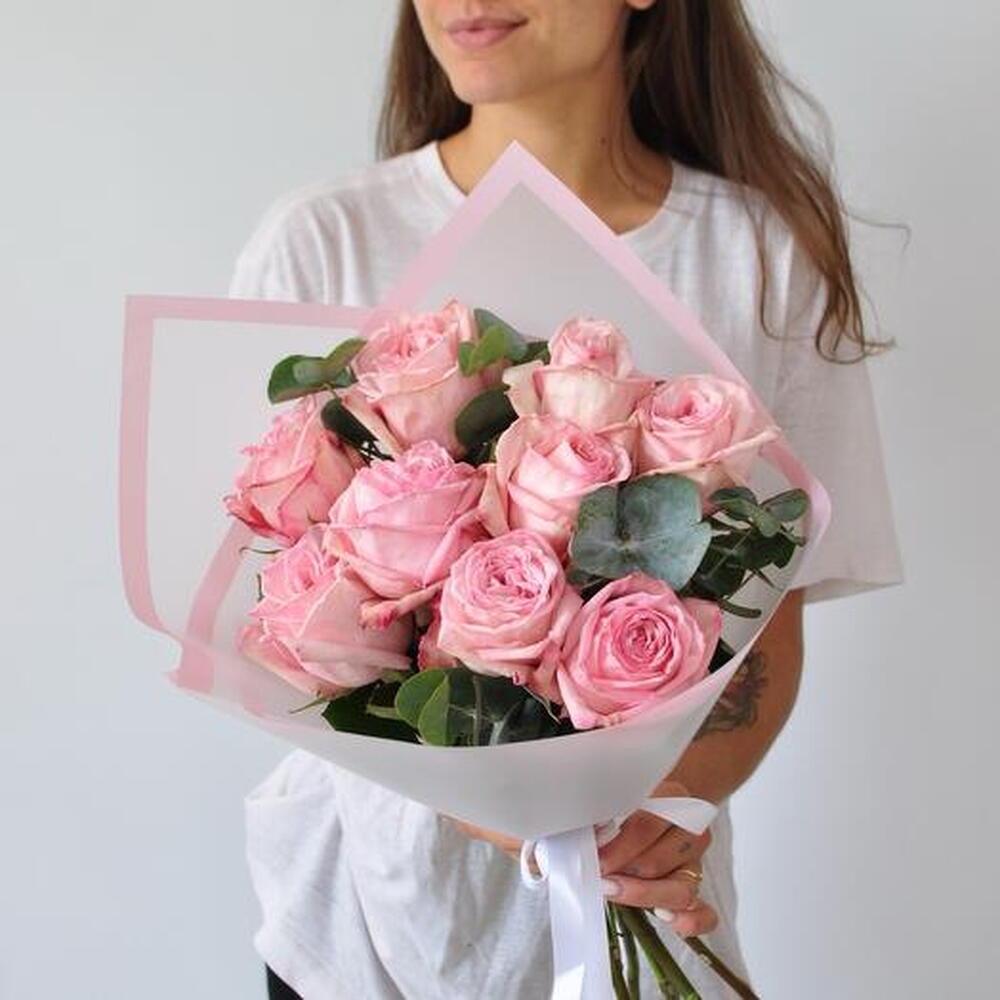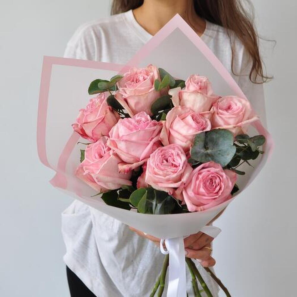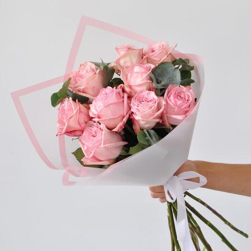 Satin ribbon - 1 pce Eucalyptus - 1 pce matte packaging - 1 pce pink o'hara roses - 9 pce
