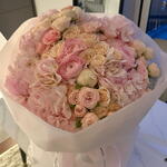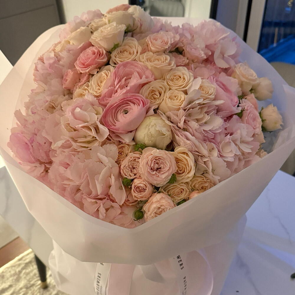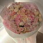 Ribbon - 1 pce Spray rose - 15 pce hortensia - 5 pce ranunculus - 4 pce wrapping paper - 6 pce