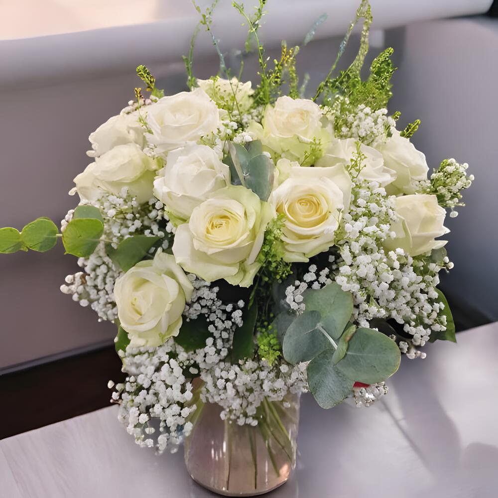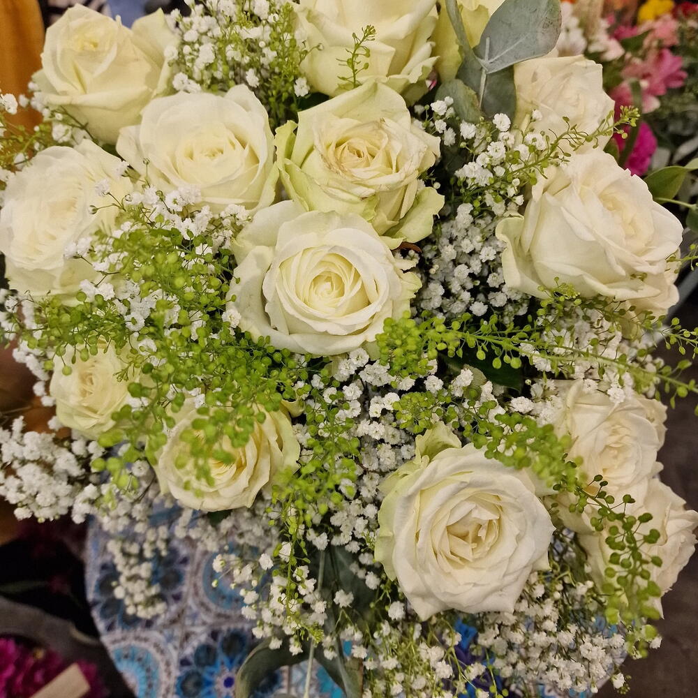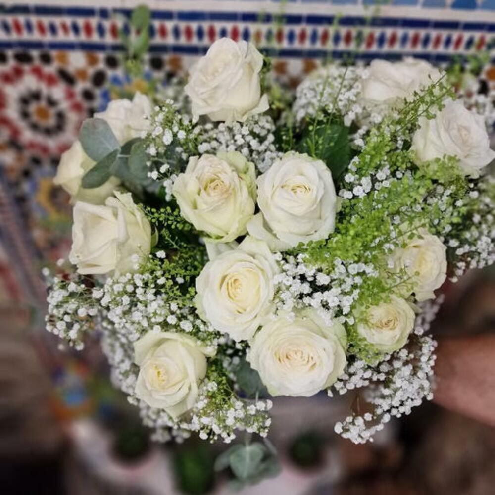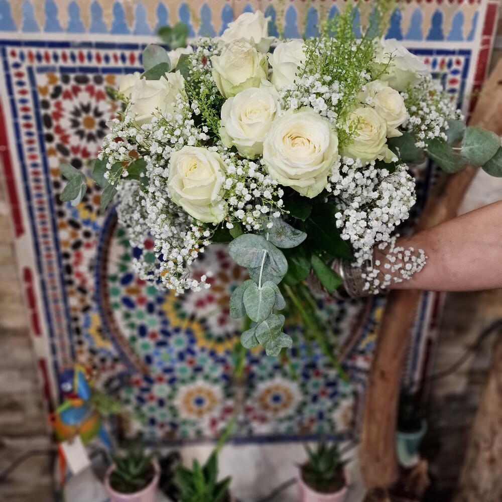 Eucalyptus - 5 pce Gypsophila - 3 pce rose blanche avalanche - 10 pce