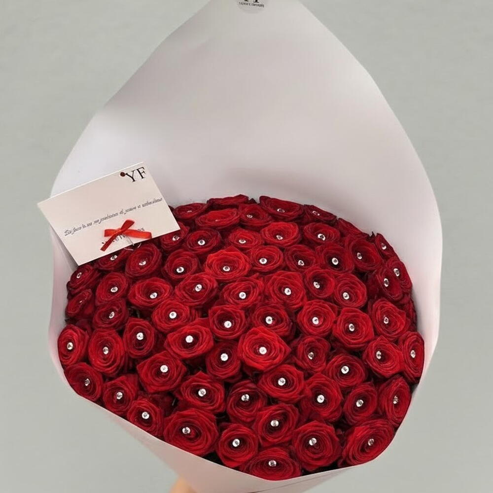Ce bouquet spectaculaire de roses rouges ornées de délicats cristaux incarne le luxe, la passion et l’élégance absolue. Chaque rose est soigneusement travaillée et sublimée par une touche scintillante qui capte la lumière et attire tous les regards. La composition dense et parfaitement arrondie crée un effet « wow » immédiat, idéal pour marquer les grands moments. Son emballage clair et raffiné met en valeur l’intensité du rouge et le caractère précieux du bouquet. Il est parfaitement adapté pour une déclaration d’amour inoubliable, une demande en mariage, un anniversaire important, la Saint-Valentin ou une occasion d’exception. Pour préserver la fraîcheur des fleurs, il est conseillé de changer l’eau régulièrement, de recouper les tiges en biais et de conserver le bouquet à l’abri du soleil direct et des sources de chaleur.
