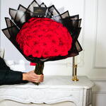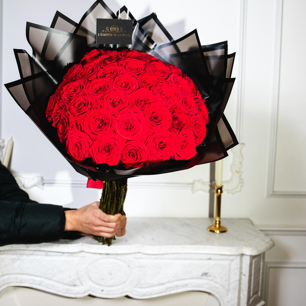 A stunning bouquet of 50 fresh red roses, presented in a sleek black transparent packaging