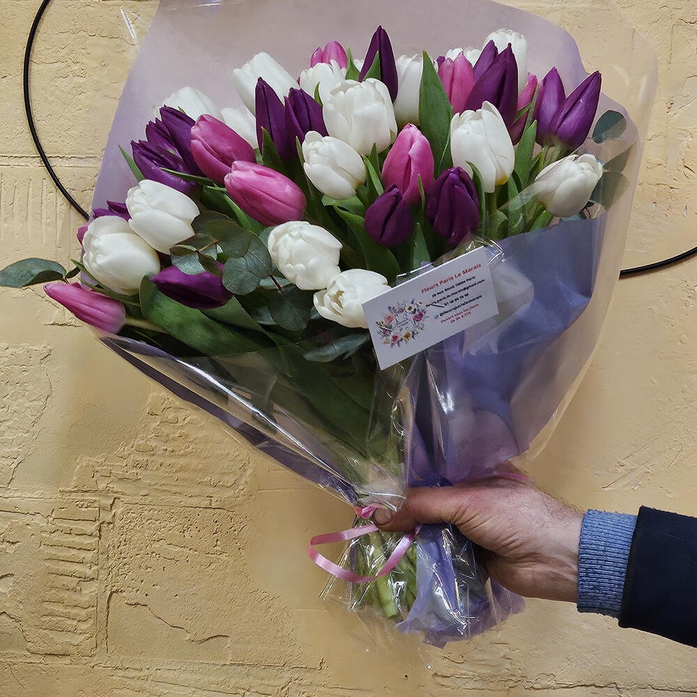 Cet exquis bouquet mono-fleur, composé de 50 tulipes soigneusement sélectionnées, est une véritable explosion de beauté. Lélégance prédominante des 20 tulipes blanches se mêle à la tendresse des 10 tulipes roses et à lintensité des 20 tulipes bordeaux, produisant un véritable tourbillon de couleurs. Offrir ce bouquet, cest promettre un instant de pure émotion à son destinataire. Parfaitement adapté pour tous les occasions, cet arrangement floral apportera une touche de fraicheur et de raffinement.