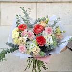Eucalyptus - 3 pce Lisianthus - 3 pce rose - 3 pce œillet - 7 pce chrysanthème - 3 pce emballage - 1 pce