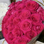 A luxurious bouquet of vibrant hot pink roses arranged in a perfect dome shape. Each rose is carefully selected for its freshness and rich color, creating a full and elegant composition. Wrapped in stylish white paper with gold edges, this bouquet is a true statement of love, passion, and sophistication. Perfect for birthdays, anniversaries, or any special moment.