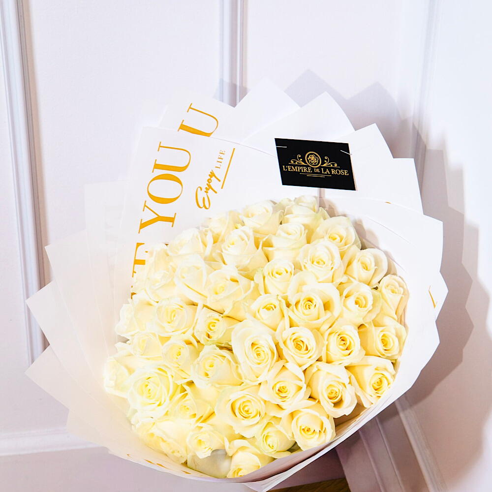 A timeless expression of grace and sophistication, the Ivory Elegance Rose Bouquet features a luxurious dome of pristine white roses, meticulously arranged for a full, perfectly rounded silhouette. Each bloom is carefully selected for its velvety petals and soft creamy hue, creating a refined and luminous composition. Wrapped in premium designer paper with elegant gold accents, this bouquet embodies modern luxury and effortless style—perfect for meaningful moments, from romantic gestures to chic celebrations.🤍