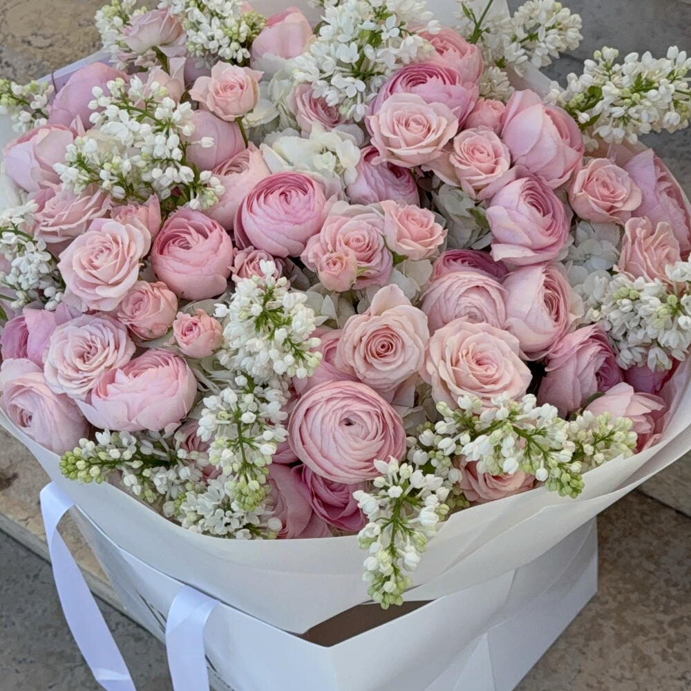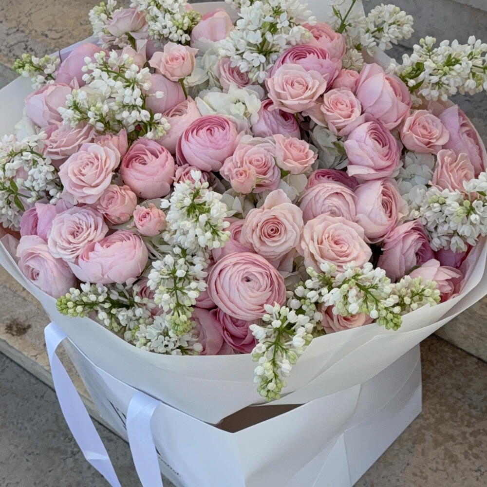 hortensia - 10 pce Lilas - 20 pce ranunculus - 40 pce spray roses - 10 pce
