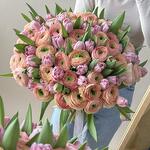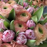 This beautiful bouquet combines 50 Coral Peach Ranunculus and 50 Double Pink Tulips, creating a harmonious blend of colors and textures. With a diameter of 45 cm, this flower arrangement is perfect for any occasion, from celebrations to heartfelt gestures.