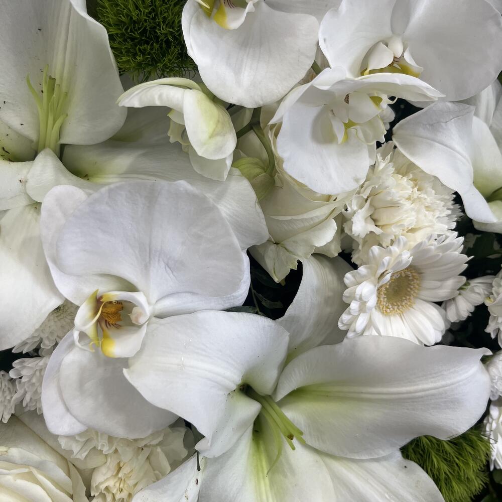 hortensia - 5 pce germini - 10 pce chrysanthème - 7 pce oeillet - 10 pce rose blanche - 10 pce lys blanc - 3 pce