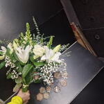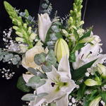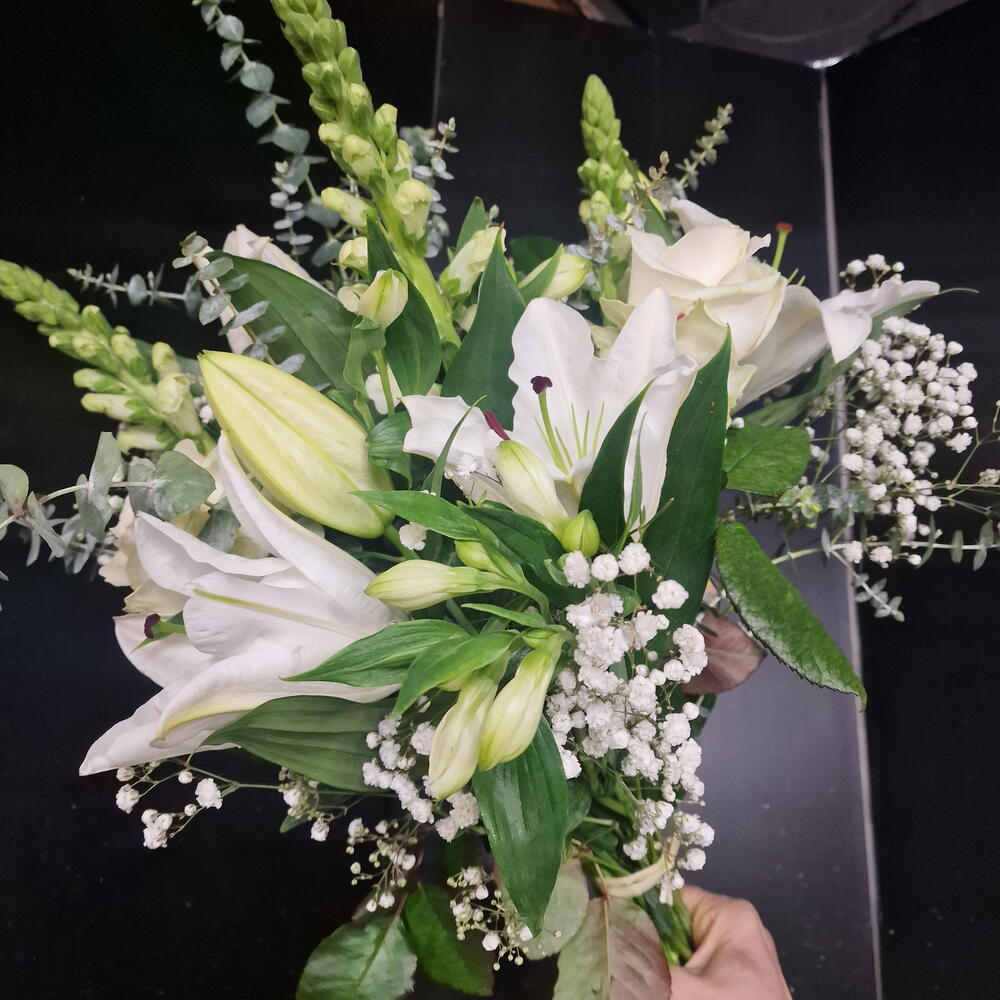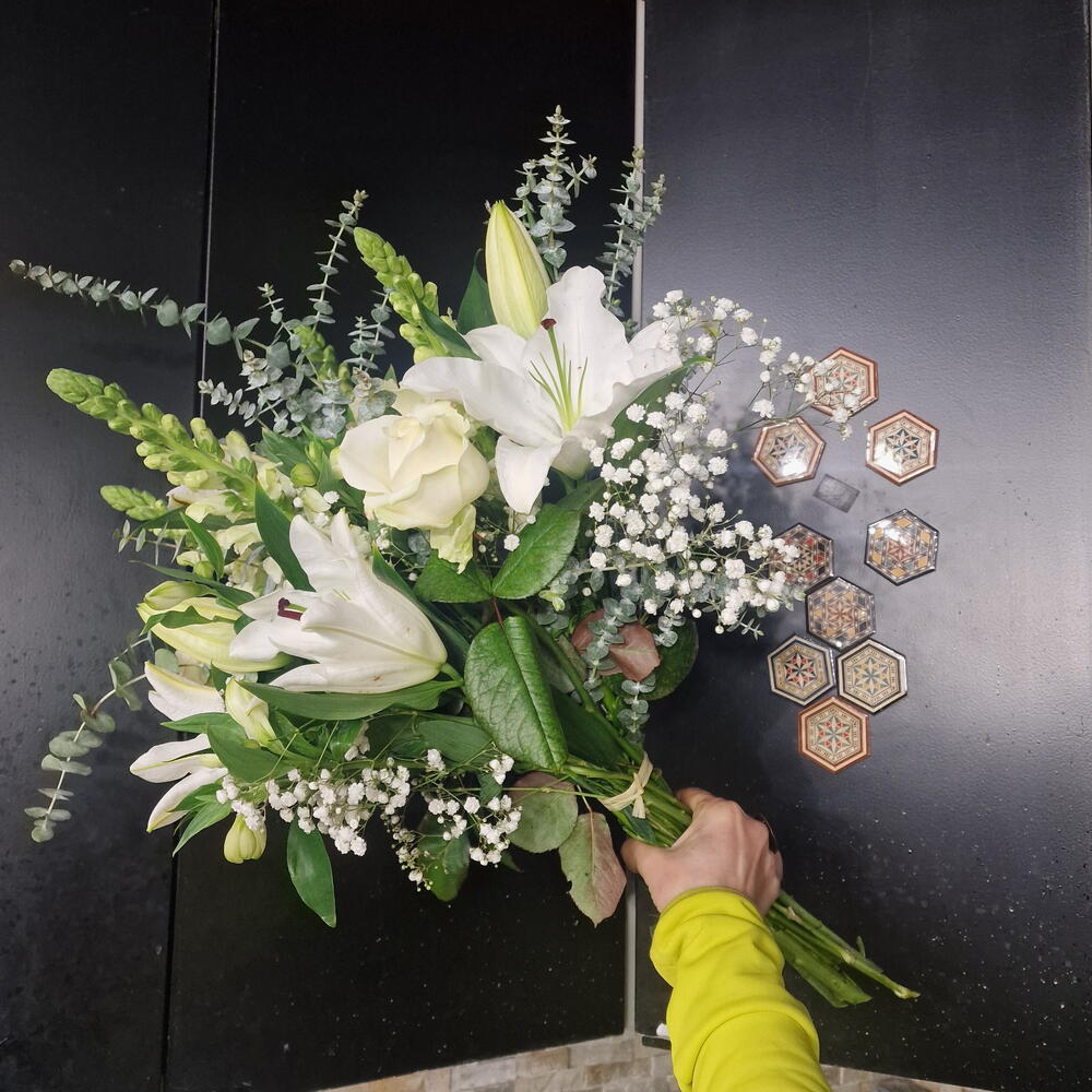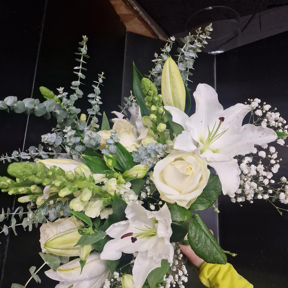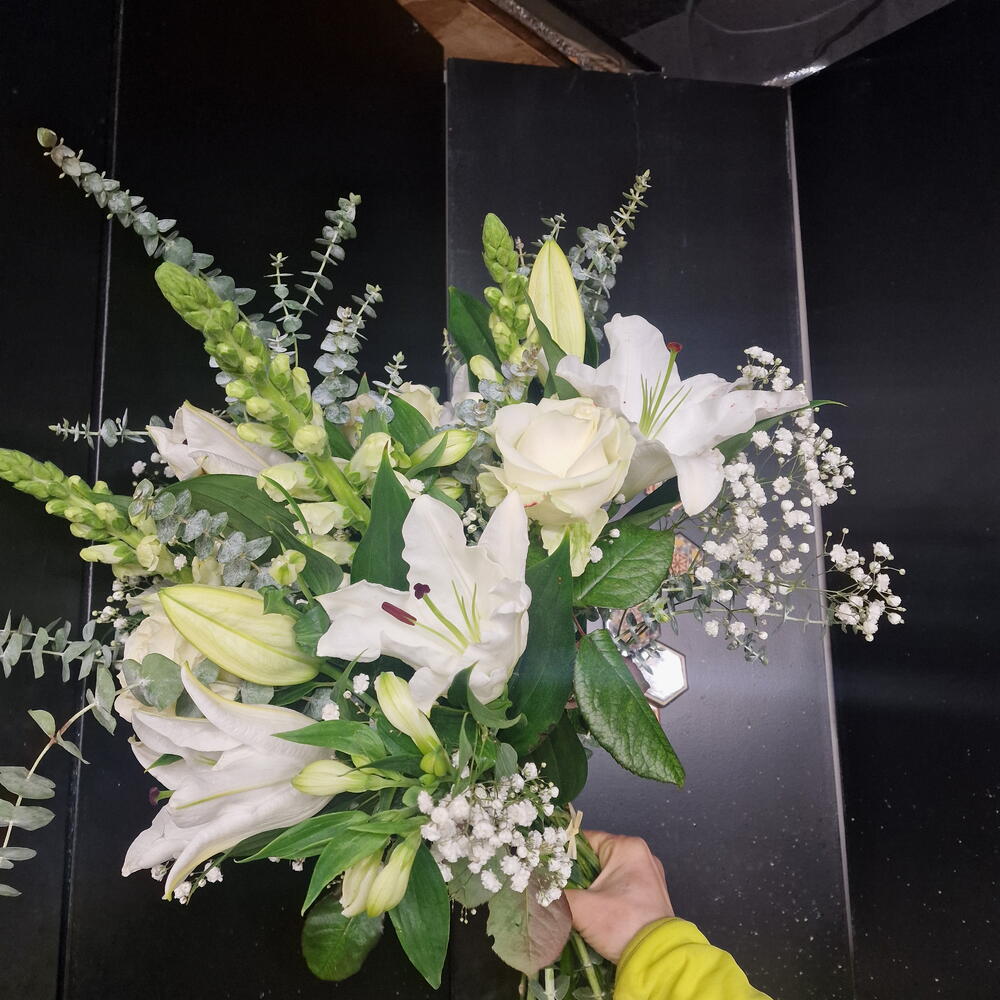 Eucalyptus - 5 pce astromelia - 5 pce lys - 5 pce gypso white - 5 pce rose blanche - 5 pce fleurette - 5 pce