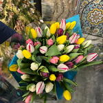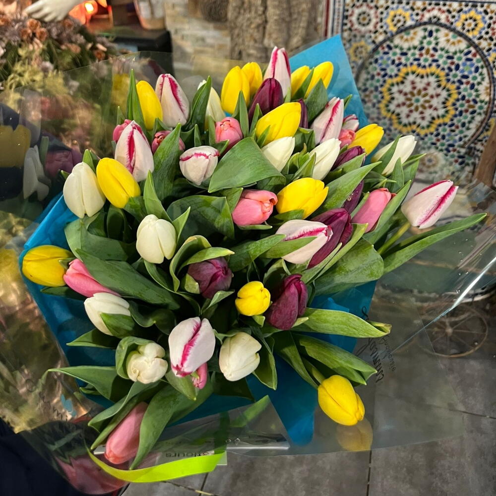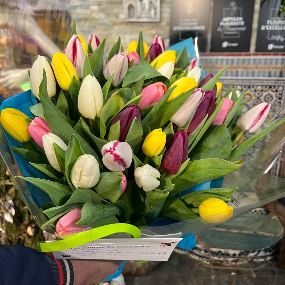 Un magnifique bouquet composé de plus de 50 tulipes, multicolore et dun feuillage qui sublime le bouquet