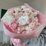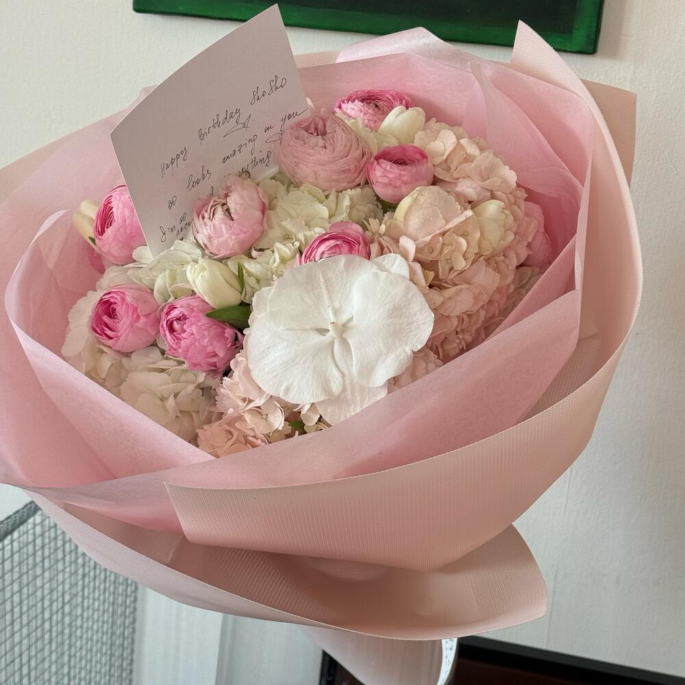 Ribbon - 1 pce Tulips - 6 pce hortensia - 6 pce Orchidée - 2 pce ranunculus - 6 pce wrapping paper - 6 pce