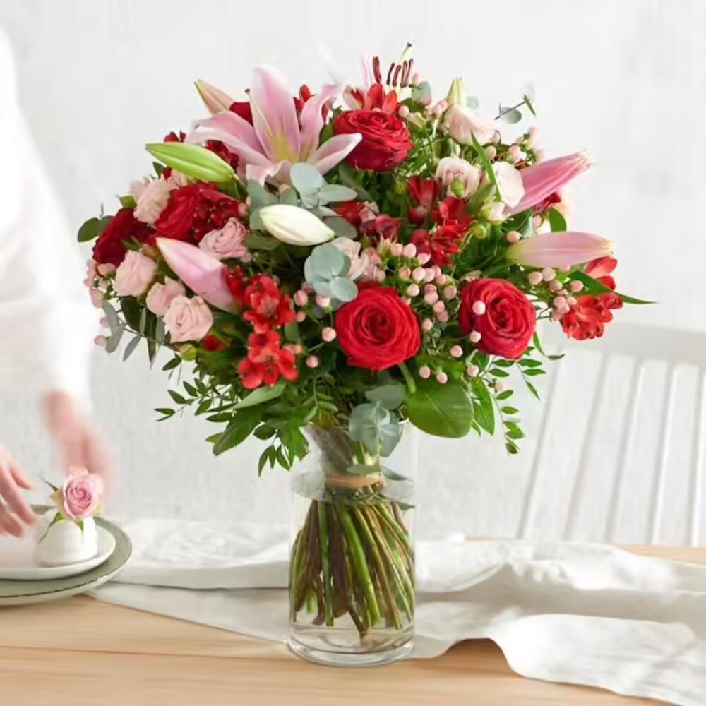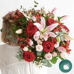 Alstroemeria - 5 pce rose - 7 pce aucaliptus - 7 pce lys - 3 pce emballage cadeau - 5 pce ruban satiné - 3 pce luntisque - 5 pce gipsophil - 5 pce oillet brancheau - 3 pce