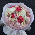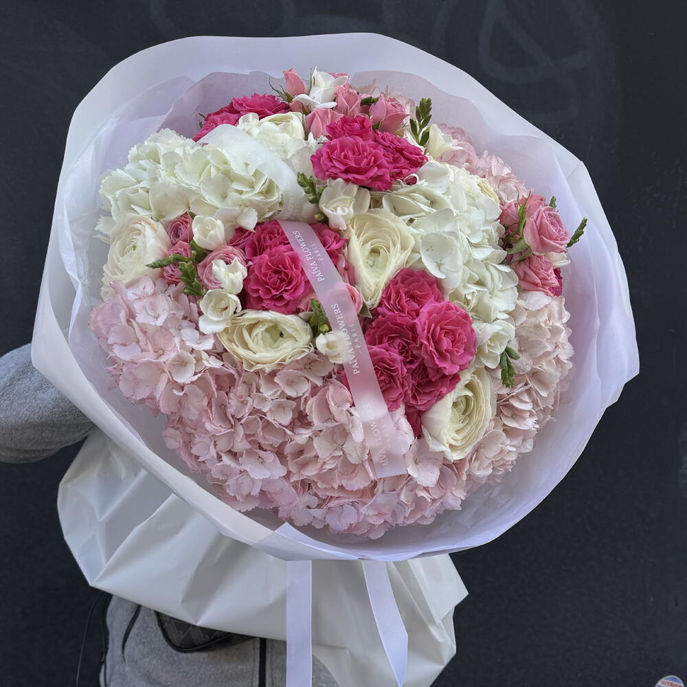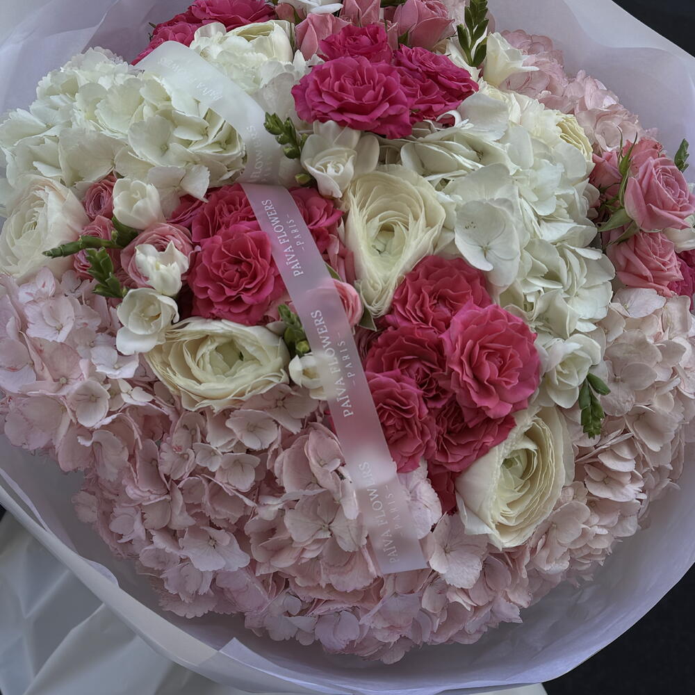 Ribbon - 2 pce hortensia - 8 pce ranunculus - 7 pce frésia - 7 pce wrapping paper - 6 pce spray roses - 10 pce
