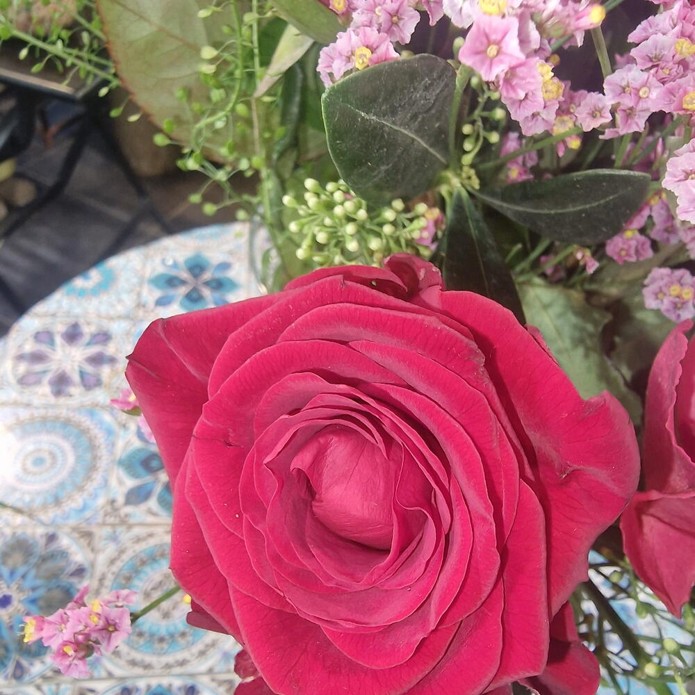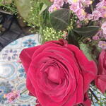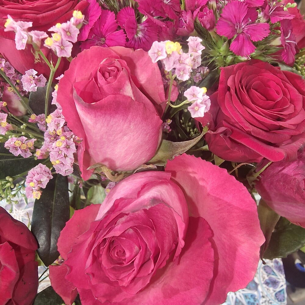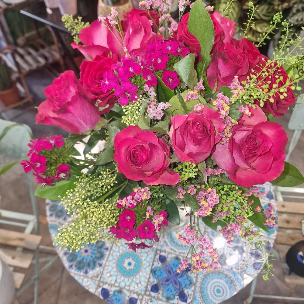 Eucalyptus - 3 pce Limonium - 5 pce feuillage - 5 pce rose rouge - 10 pce rose sose - 10 pce