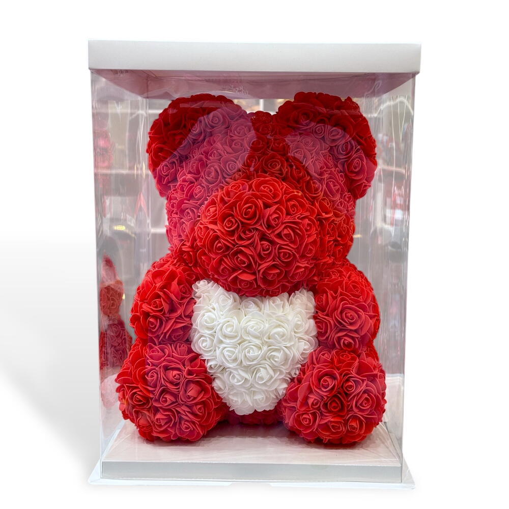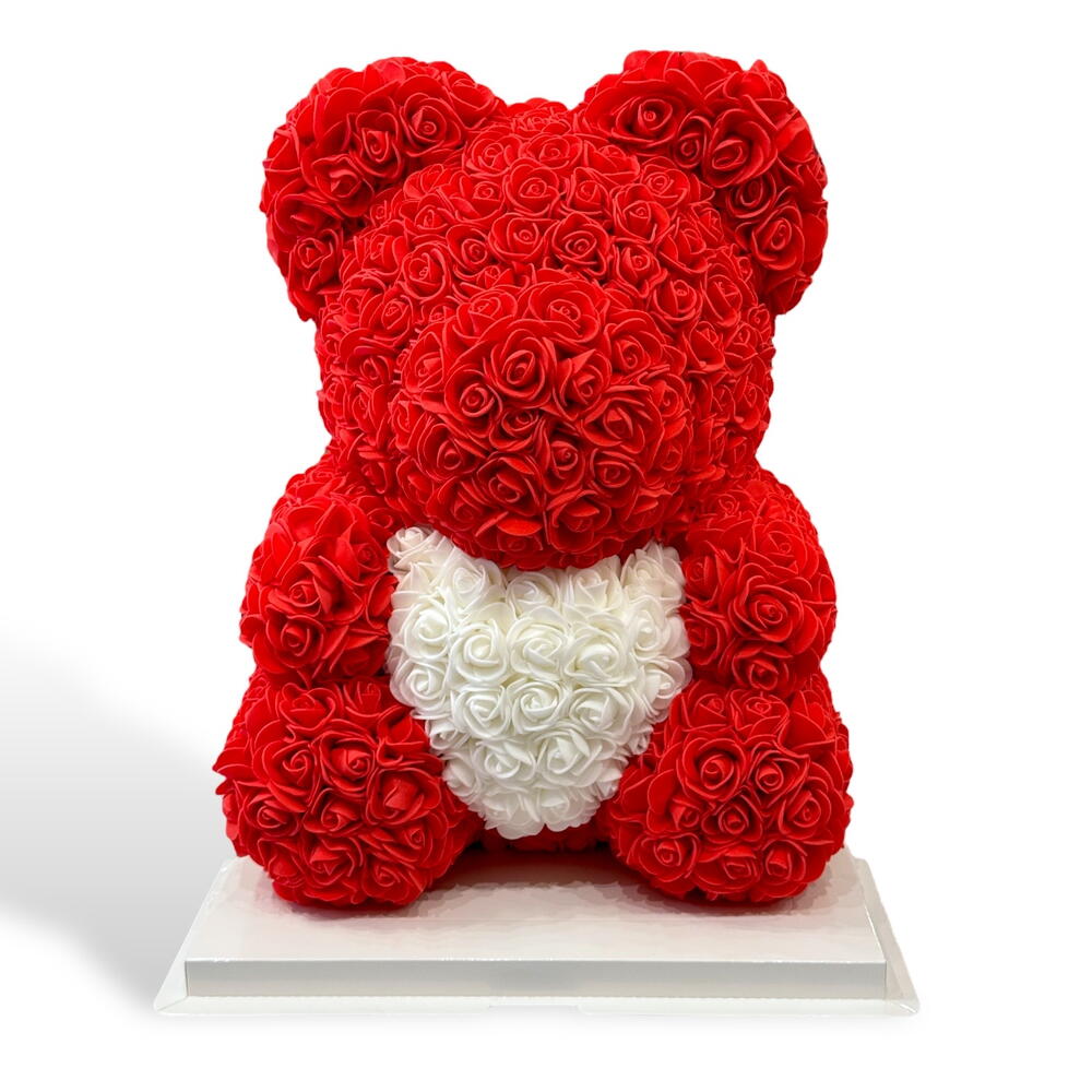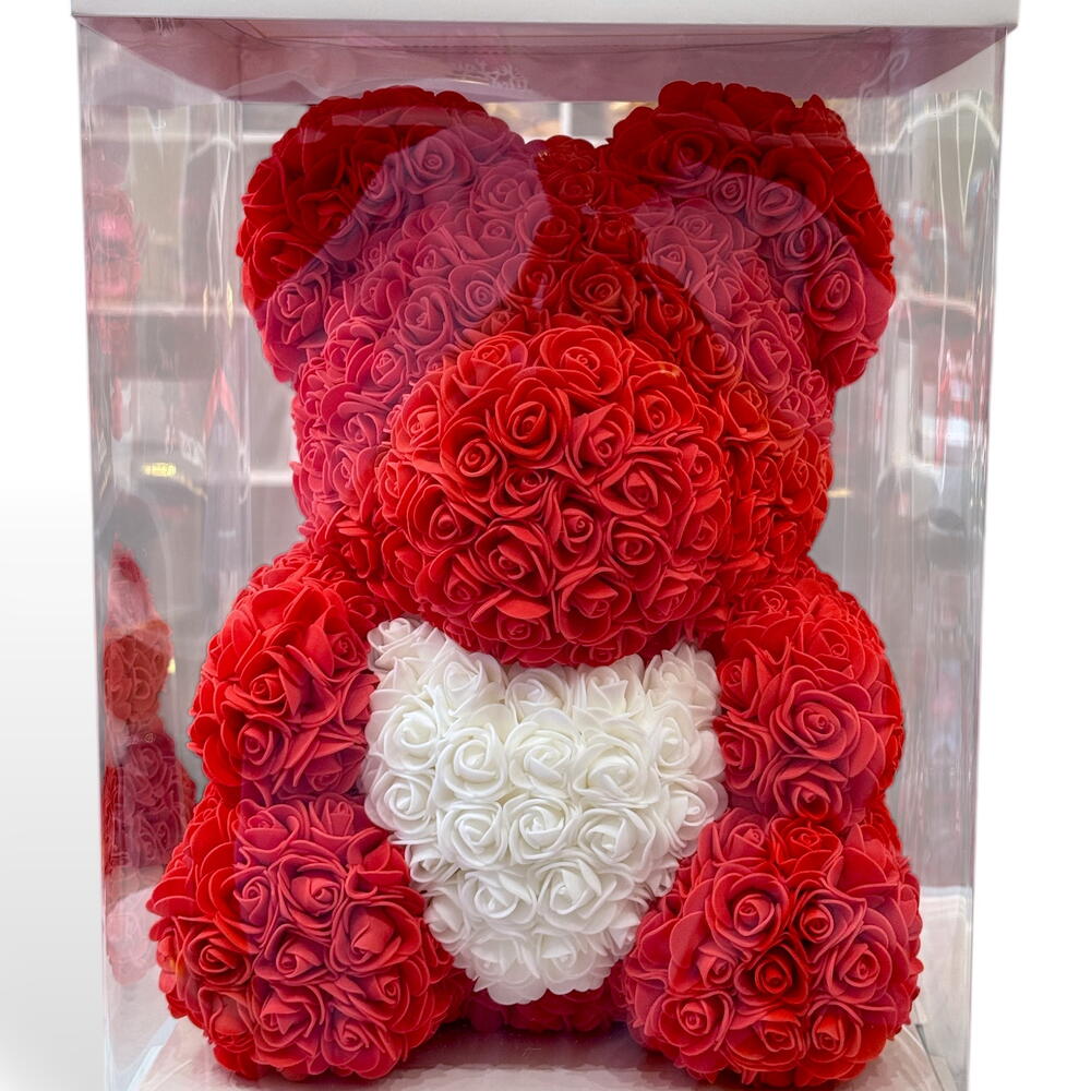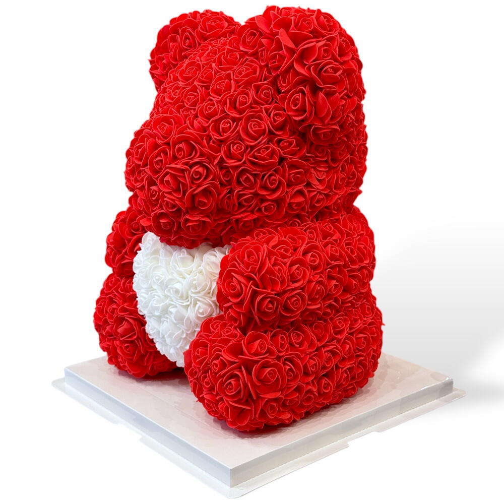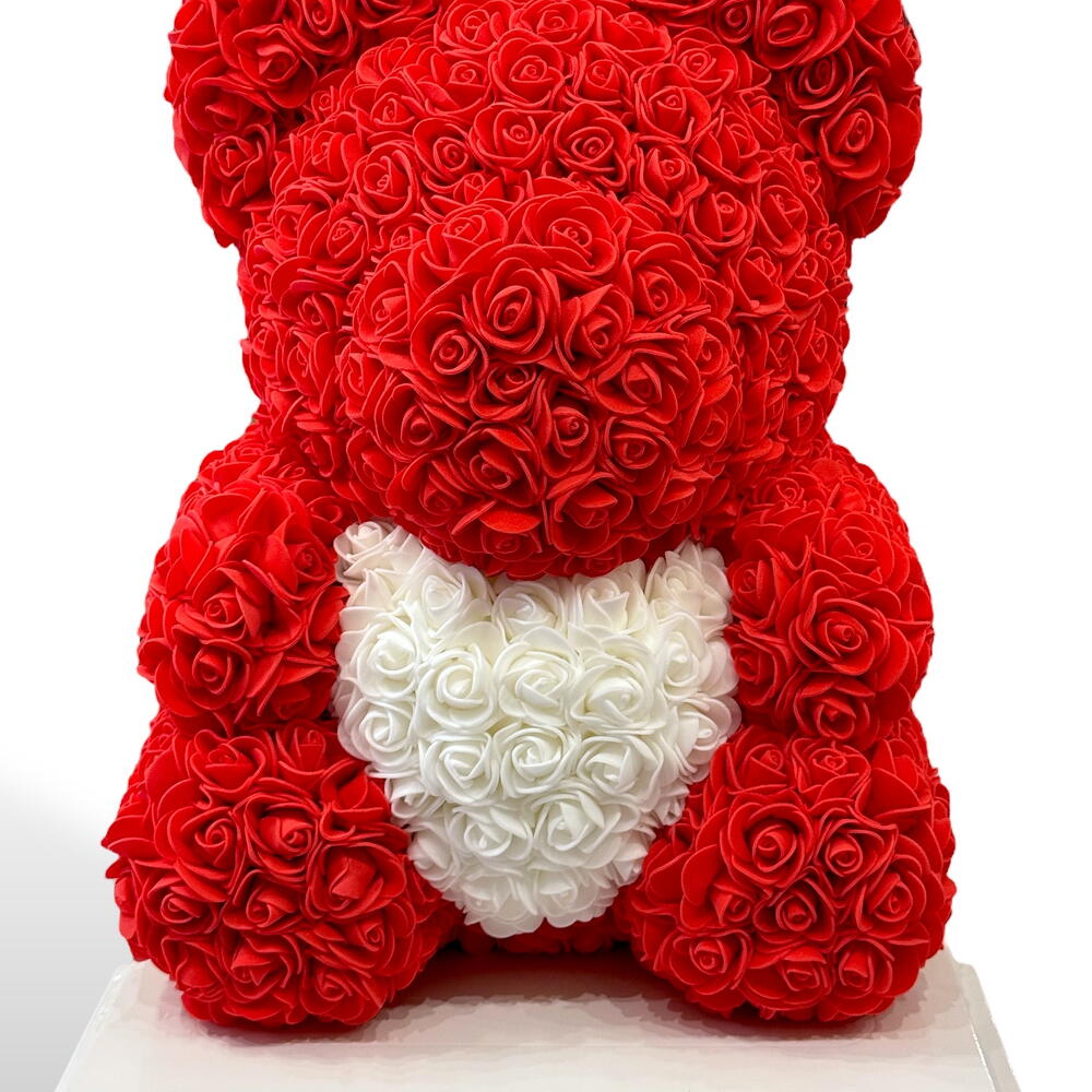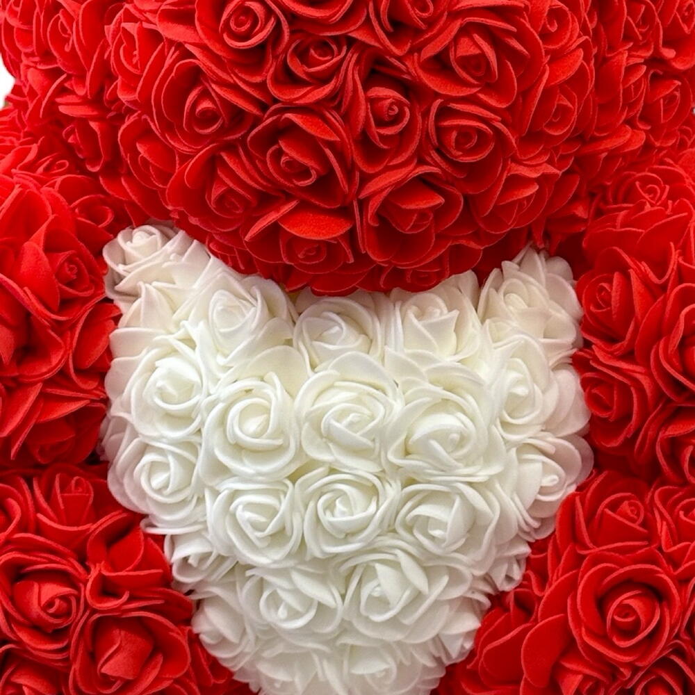 Ours en roses – Édition Rouge Blanche Offrez un cadeau inoubliable avec cet adorable ours entièrement composé de roses artificielles d’une grande qualité. Avec son corps rouge passion et son cœur blanc délicat, il incarne parfaitement l’amour, la tendresse et l’élégance. Parfait pour la Saint-Valentin, un anniversaire, une déclaration d’amour ou simplement pour faire plaisir à quelqu’un de spécial. Caractéristiques : • Hauteur : environ 40 cm • Roses en mousse douce, durables et sans entretien • Livré dans une boîte cadeau élégante (optionnelle) • Ne se fane jamais — un souvenir éternel